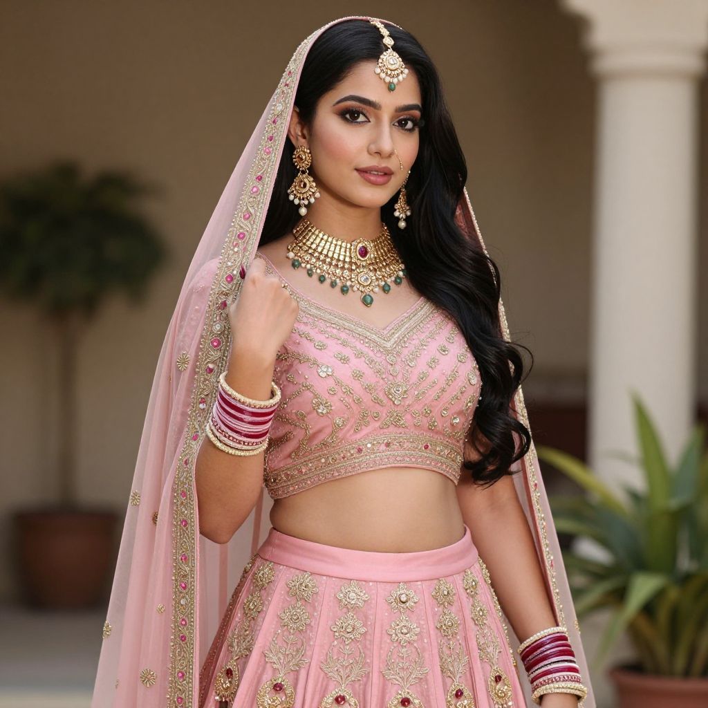 Photograph of a beautiful South Asian bride in a pink, gold-embellished traditional lehenga and dupatta, adorned with jewelry, standing indoors