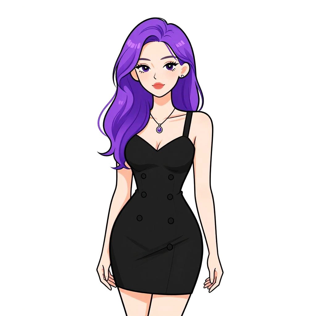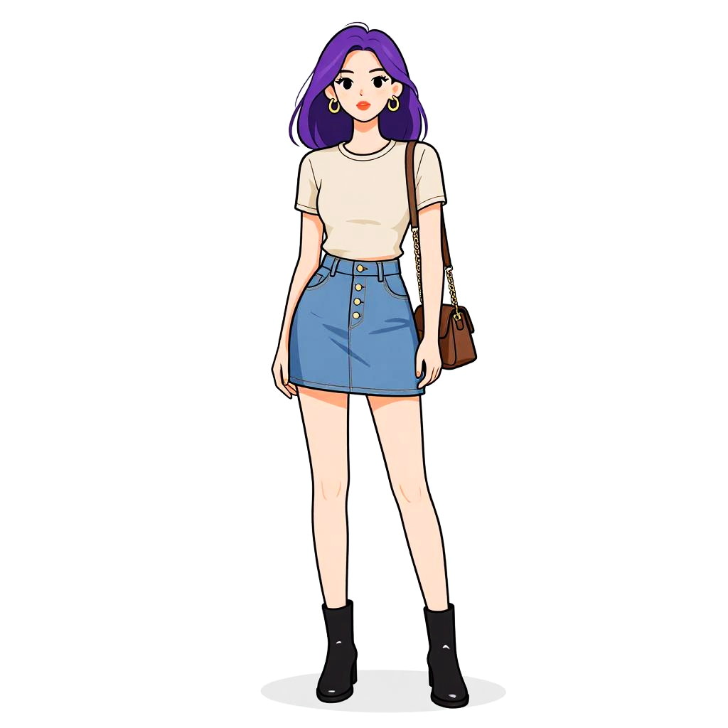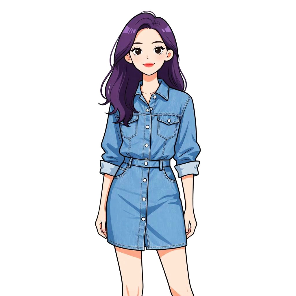 Woman with pretty face and pretty hair. Woman, casual contemporary, denim mini dress in dark wash, square neckline, thin straps, button-down front with silver buttons, fitted waistline, slight A-line skirt, hoop earrings, light makeup, neutral photo studio background. --sref 1467