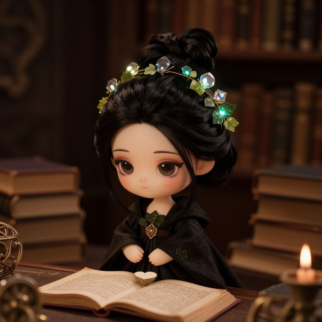 A digital CGI image of a chibi-style anime girl with large, expressive brown eyes and pale skin, sitting in a dimly lit, old library. She has long black hair styled in an updo with green and blue gemstone hairpins. She wears a black, Victorian-style dress with a green gemstone brooch. In front of her, an open book with glowing text rests on a wooden table, illuminated by a small candle. Stacks of books and more candles are blurred in the background. The warm, soft lighting enhances the mystical, enchanted atmosphere.