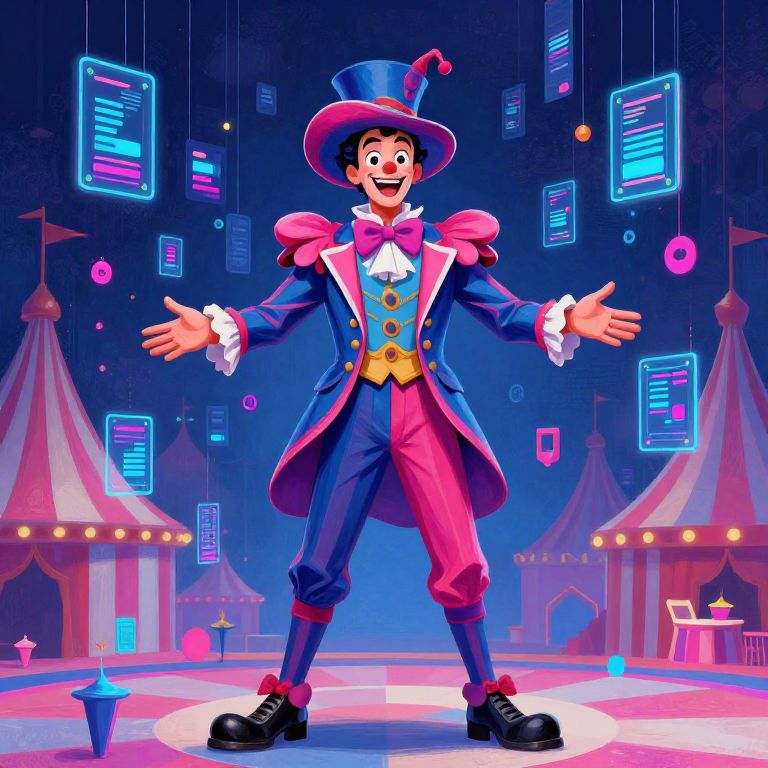 Pomni digital circus full body, imaginative digital painting of a circus character surrounded by floating data fragments, combining classic circus attire with modern digital textures, vibrant color palette of neon blues and pinks, full body portrait with exaggerated hands