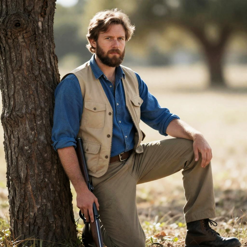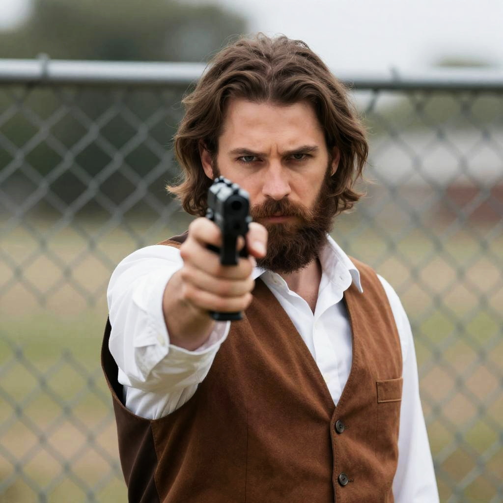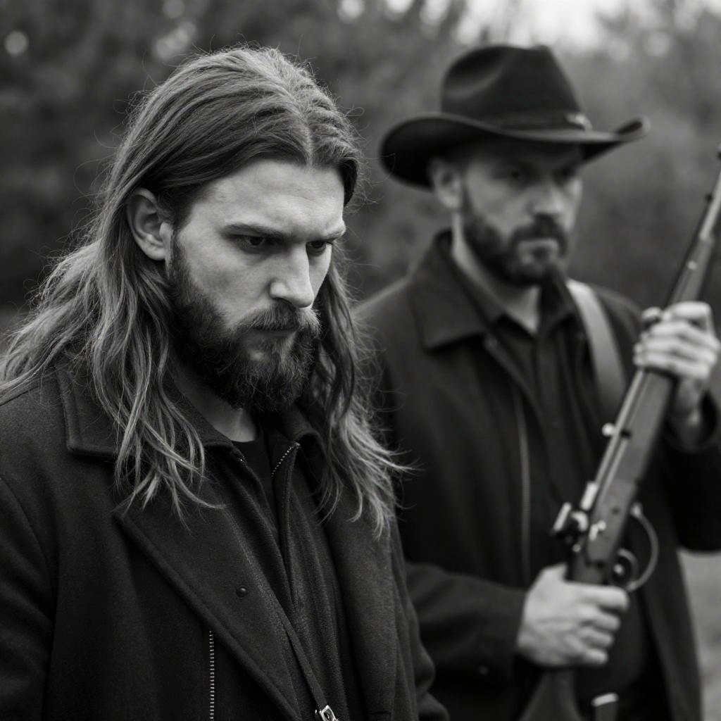 Black and white photograph of a bearded man with wavy hair in a plaid shirt, holding a rifle, aiming at a prone woman with light hair lying on the ground. Dense foliage in the background. Man's intense focus, woman's face not visible.