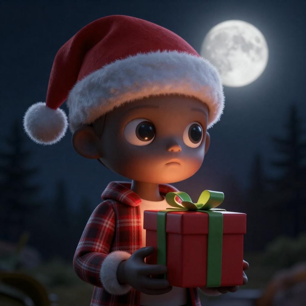 A digital artwork of a humanoid figure with large, expressive eyes wearing a red Santa hat and a plaid shirt, holding a brightly lit, red gift box with green leaves. The background is dark with a glowing moon and silhouetted trees. The figure's skin is dark, and the lighting creates a dramatic contrast.
