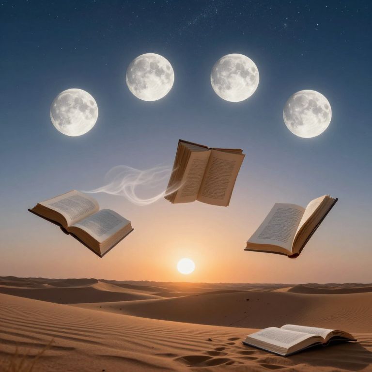 Books float serenely above a vast desert landscape, illuminated by four luminous moons and a setting sun, as gentle winds rearrange their pages into ethereal patterns against the starry sky.
