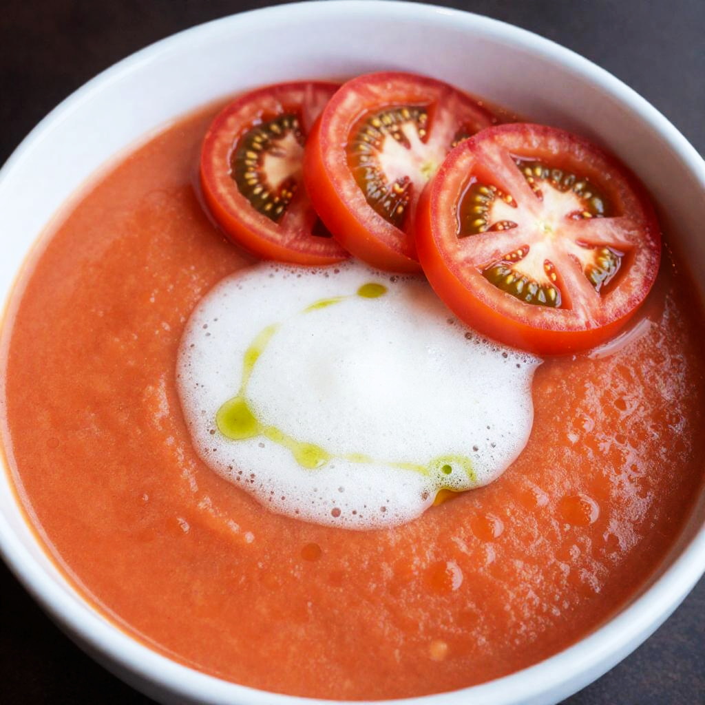 A bowl of heirloom tomato gazpacho soup garnished with three fresh tomato slices. The gazpacho is topped with a swirl of lime foam and chive oil, presenting a vibrant and fresh appearance. The dish is served in a white bowl on a dark background.