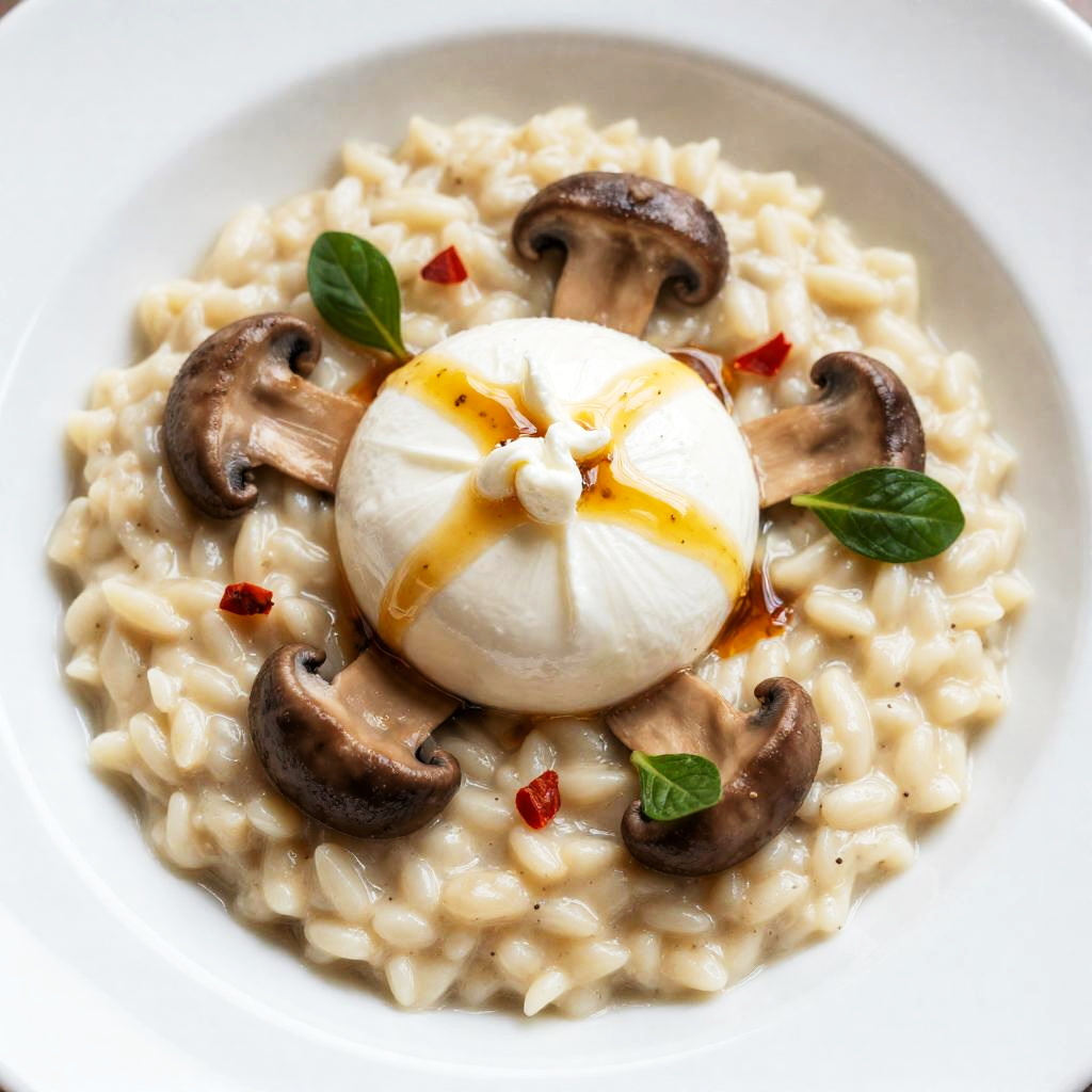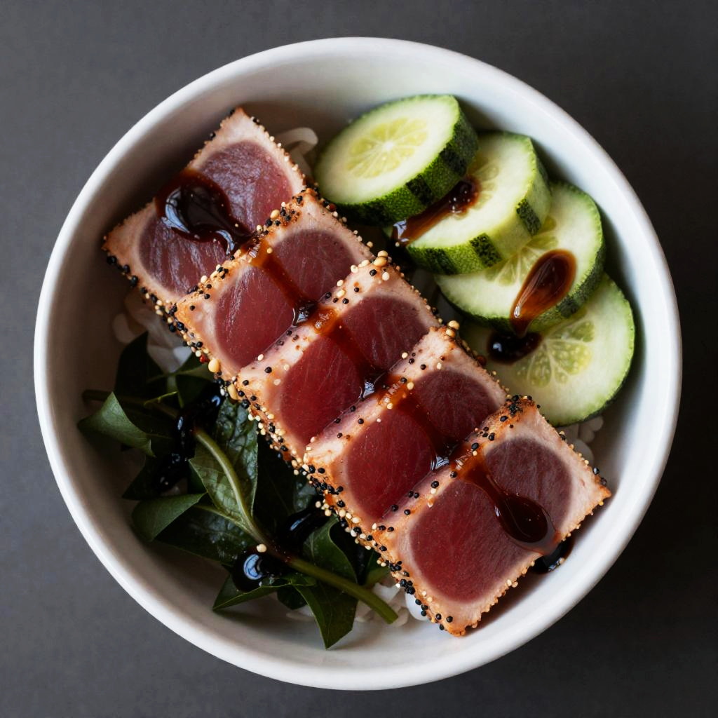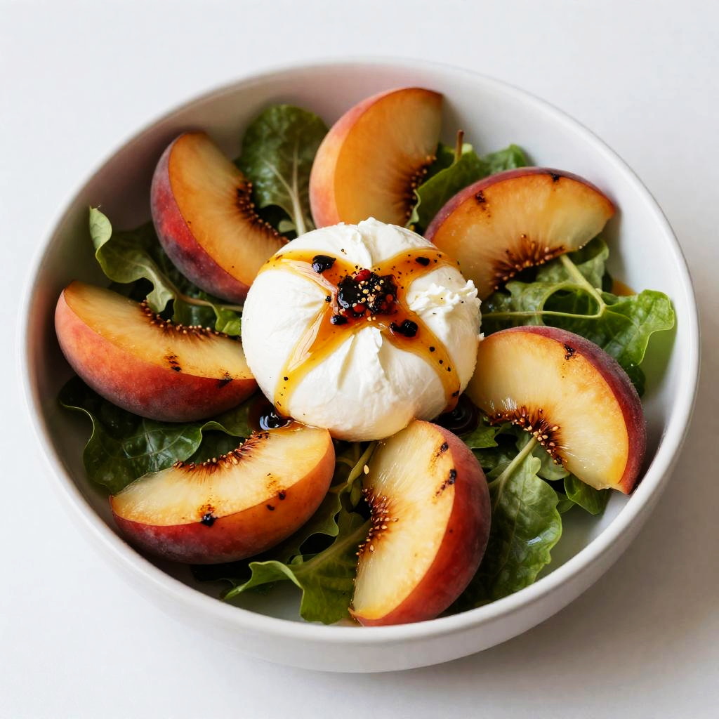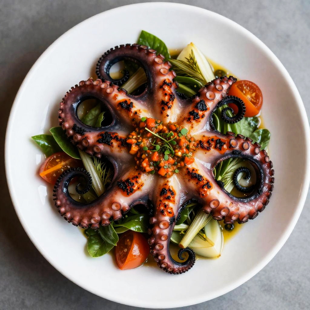 A wide shot of a Heirloom Tomato Gazpacho, featuring ripe heirloom tomatoes as the star of the dish. The bowl is beautifully arranged with fresh ingredients and a chive oil and lime foam drizzled over the top, creating a vibrant and appetizing presentation.