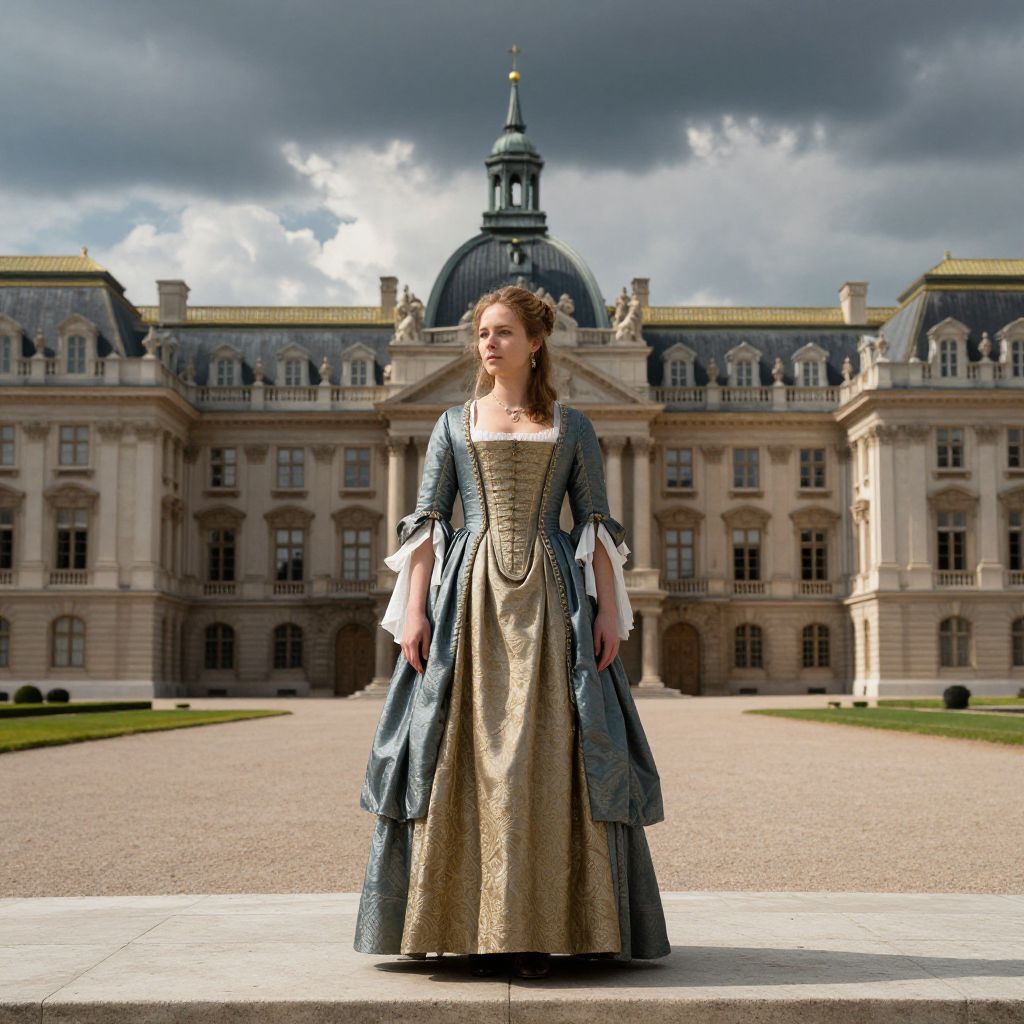 Photograph of a young woman standing in front of an ornate, baroque-style palace with a domed roof under a dramatic, cloudy sky. She wears a detailed, historical-style dress with a blue, brocade outer layer and a gold, intricately patterned underdress. Her brown hair is styled in an updo, and she holds the blue layer's sleeves, which are puffed and adorned with pink fabric. The palace features tall, arched windows and columns, with a gravel pathway leading to the foreground. The overall composition emphasizes the grandeur of the palace and the elegance of her attire.