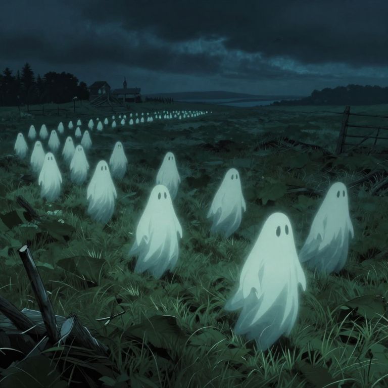 This digital illustration depicts a dark, eerie night scene with a field of glowing white ghostly figures, each resembling a simple, transparent, cartoon-like specter with small black eyes. They are scattered across the grassy field, leading the viewer's eye into the distance where they converge into a single point. The background features a dark, cloudy sky and silhouetted trees and a distant farmhouse. In the foreground, a broken wooden fence adds to the spooky atmosphere. The overall color palette is dominated by deep blues and greens, enhancing the ghostly, otherworldly feel.