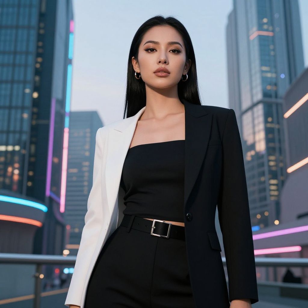 Blonde woman in a futuristic cityscape at dusk, neon lights reflecting off glass buildings, wearing sleek metallic jacket, confident pose, cinematic cyberpunk aesthetic with glowing elements