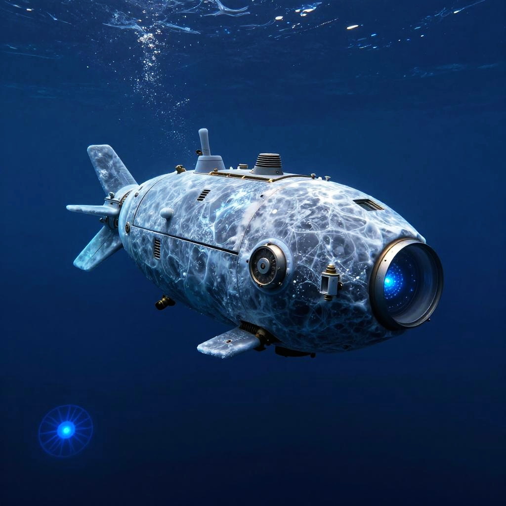Sonda descending into an ocean on an icy exoplanet, icy blue tones, robotic submersible design, dramatic underwater shot with bioluminescent creatures, sci-fi exploration theme, cinematic realism and detail