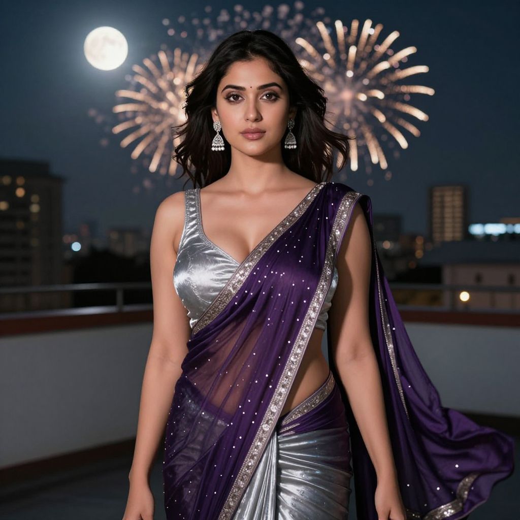 Photograph of a confident South Asian woman with medium brown skin and long, wavy black hair, walking on a rooftop at night. She wears a shiny silver halter top and a deep purple saree adorned with sparkling sequins, draped over one shoulder. She has large, dangling silver earrings. Behind her, colorful fireworks light up the night sky, with a full moon visible. City buildings are silhouetted in the background, adding an urban feel. The overall lighting highlights her outfit and facial features, creating a glamorous, festive atmosphere.