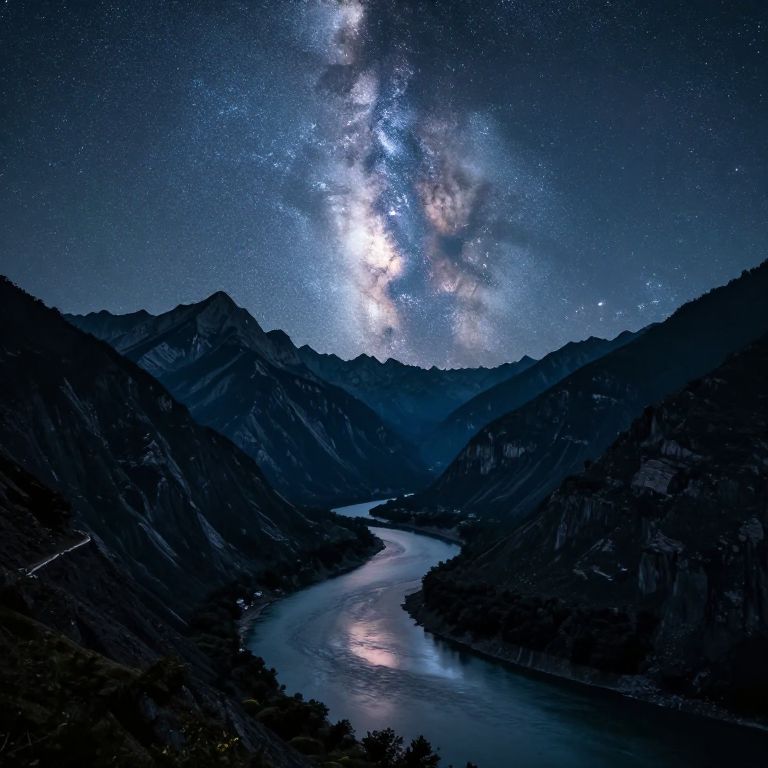 Silent peaks stand sentinel under a starlit sky, their jagged silhouettes framing a tranquil river that winds through the valley below, reflecting the cosmic glow of the Milky Way above.