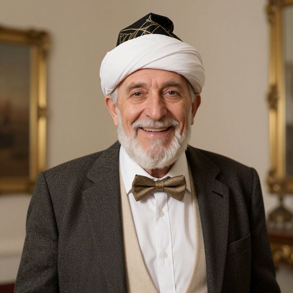 Old Person Dress Party Costume, an old man in a turban and a hat is smiling