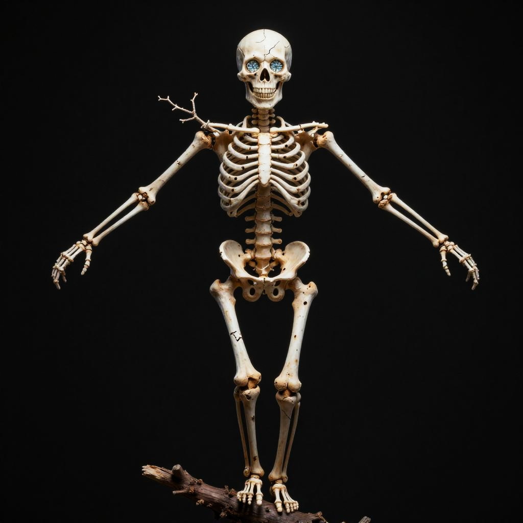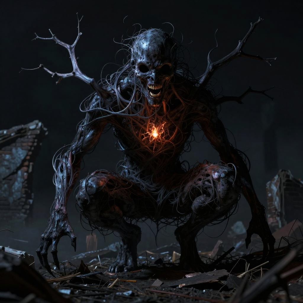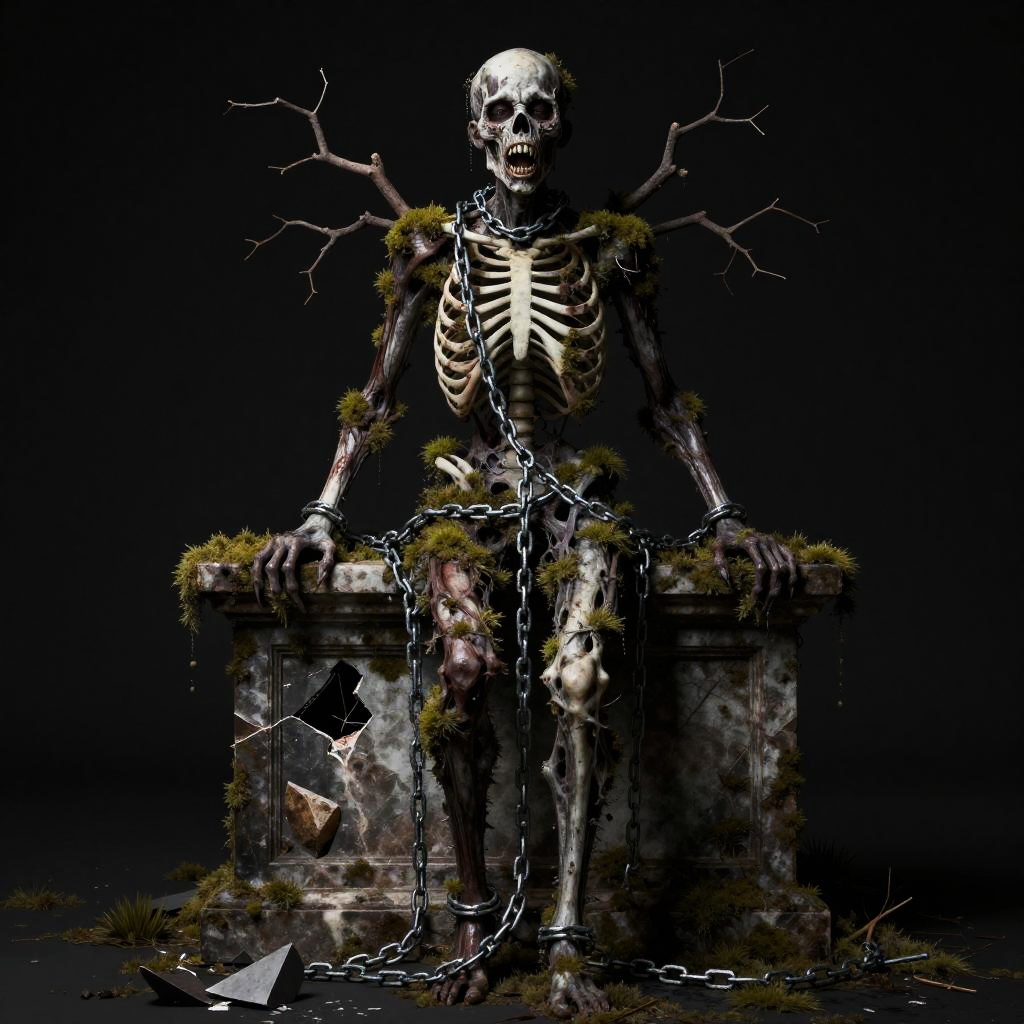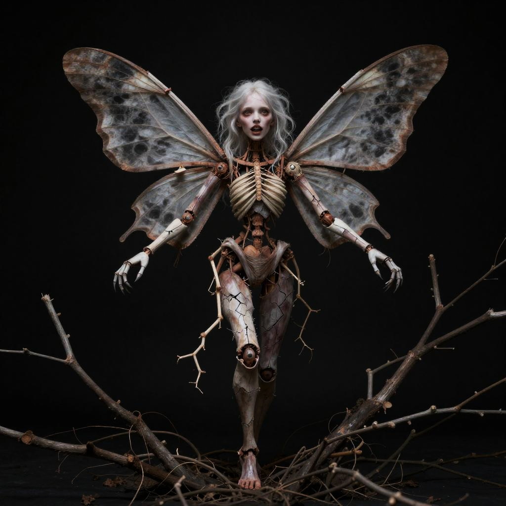 Full body, solo, wispy revenant swathed in shredded linen, strands floating weightlessly, branches reaching out, teeth baring, looking at viewer, hovering gently among swirling forlorn leaves, wistful melancholy greeting the endless void, black background
