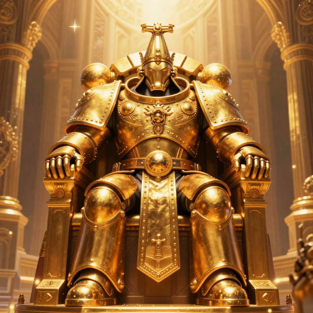 Majestic and realistic depiction of the Emperor of Mankind dressed in detailed golden armor, seated on an ornate golden throne inside a grand hall with ethereal light illuminating the scene. The figure features intricate embellishments and regal design elements reflecting power and authority.