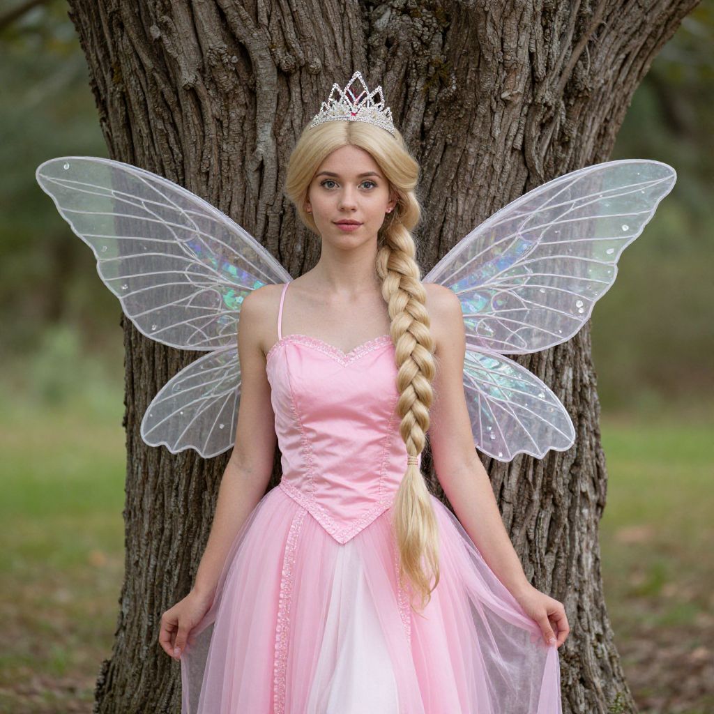 Photograph of a blonde girl with a long braid, wearing a pink dress, fairy wings, and a white tiara, standing against a tree
