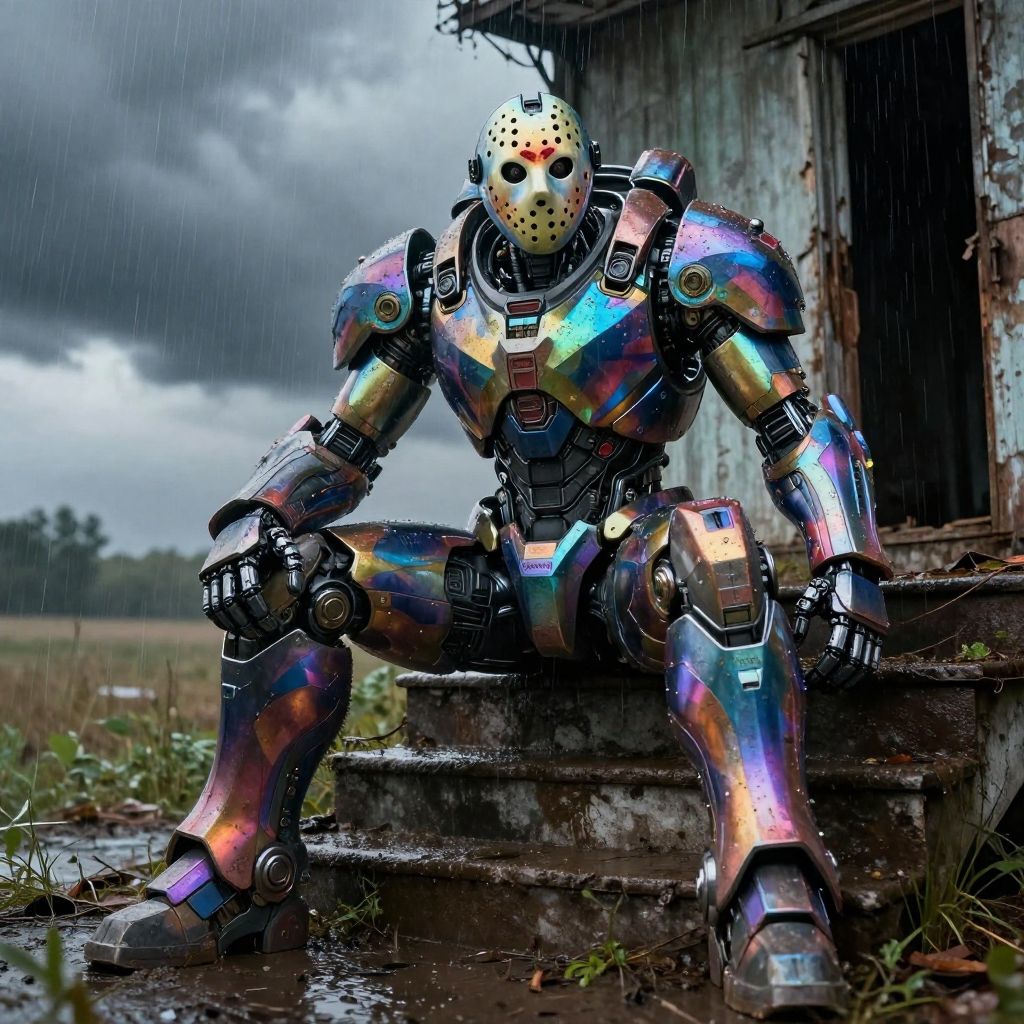Photorealistic digital artwork of a colorful, iridescent robotic figure with a horror mask, sitting on rusted steps in a rainy, abandoned warehouse
