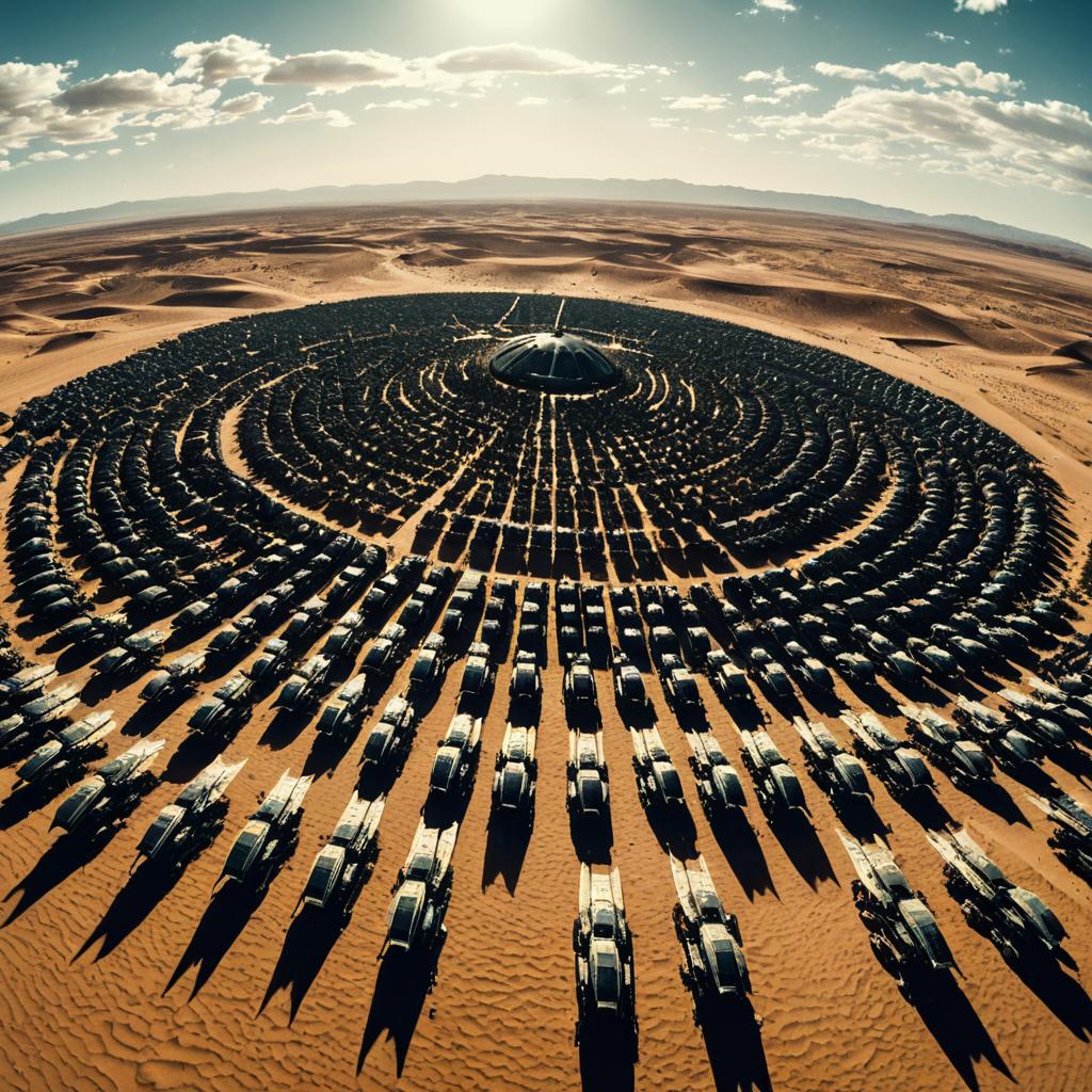 A high-angle satellite view of an intense alien desert conflict captured with a fisheye lens. Rows of large insectoid alien armies are lined up in vast circular formations on an arid desert plain surrounded by dunes. Rising smoke and clouds are visible, indicating widespread fighting across the landscape at sunset.