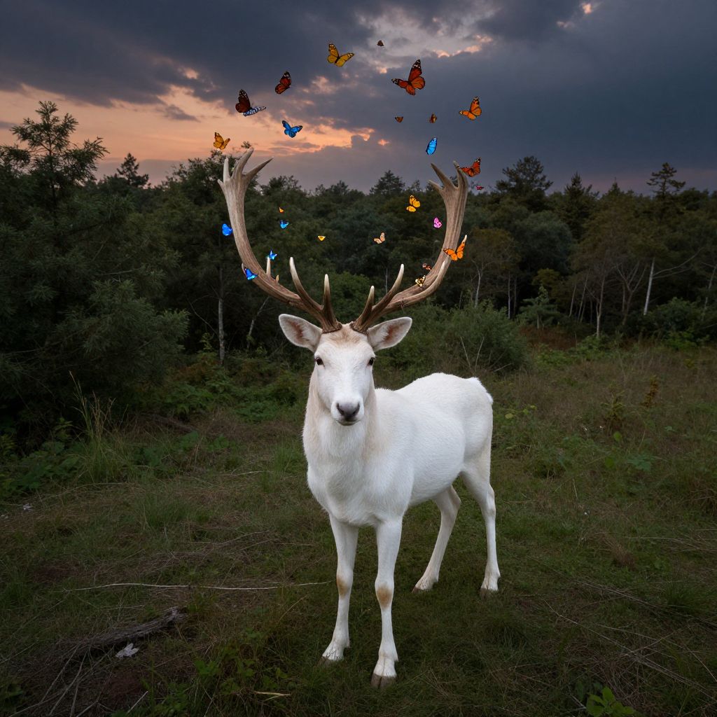 Photograph of a surreal scene featuring a white deer with large, multi-branched antlers standing in a grassy field. Butterflies in vibrant colors—orange, yellow, blue, and red—float above the deer's antlers. The background shows a dense forest under a dramatic, darkening sky with purple and orange hues. The deer's coat is smooth and pristine, contrasting with the rich, textured foliage and the moody sky. The image combines realism with fantasy elements, creating a magical, ethereal atmosphere.