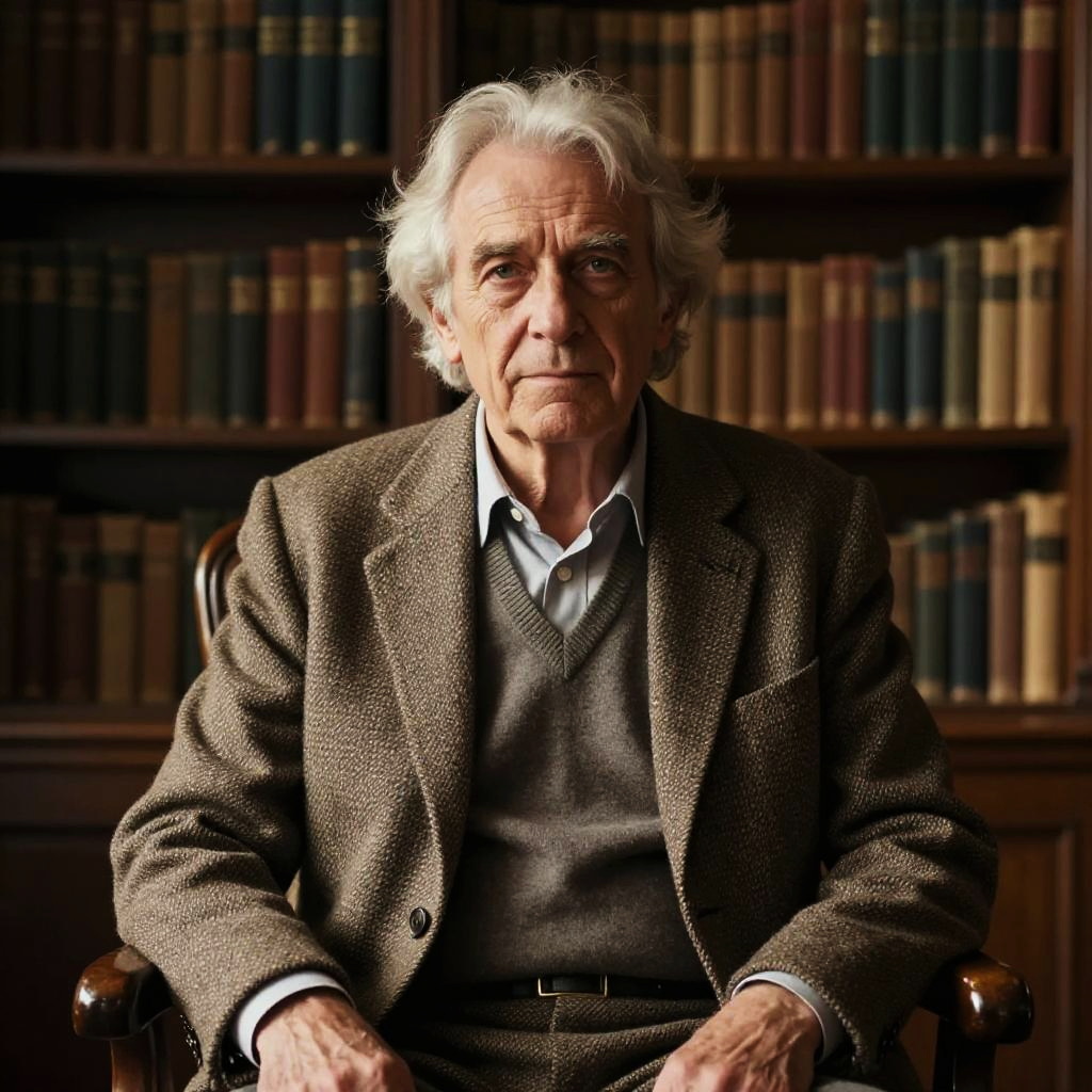 Elderly man, Stoic Frame, Thinning White Hair, kelsey plum outfit, tweed jacket, corduroy trousers, leather brogues, classic portrait