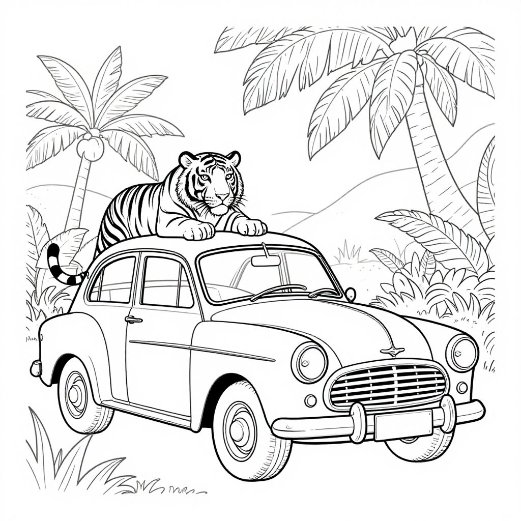 Vintage Car coloring page for adults, tiger in jungle, white background, clean line art, fine line art,