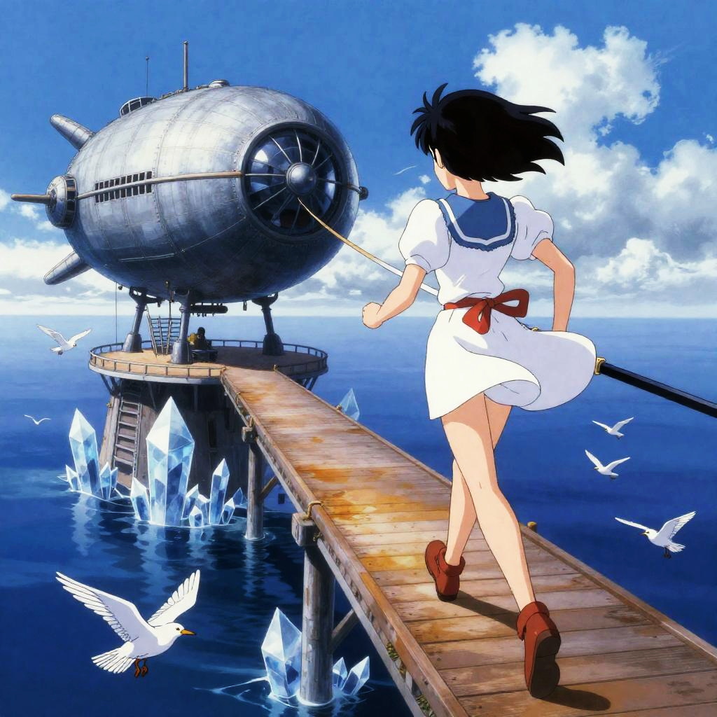 Miniskirt sky swordswoman, Satoshi Kon, Surreal, mysterious, bizarre, fantastical, fantasy, sci-fi, Japanese anime, airship moored to an aerial wharf above a crystalline ocean at golden hour, miniskirt beautiful swordsman running towards the airship on the tethered rope, perfect voluminous body, blue sky, clouds, detailed masterpiece bird’s eye views