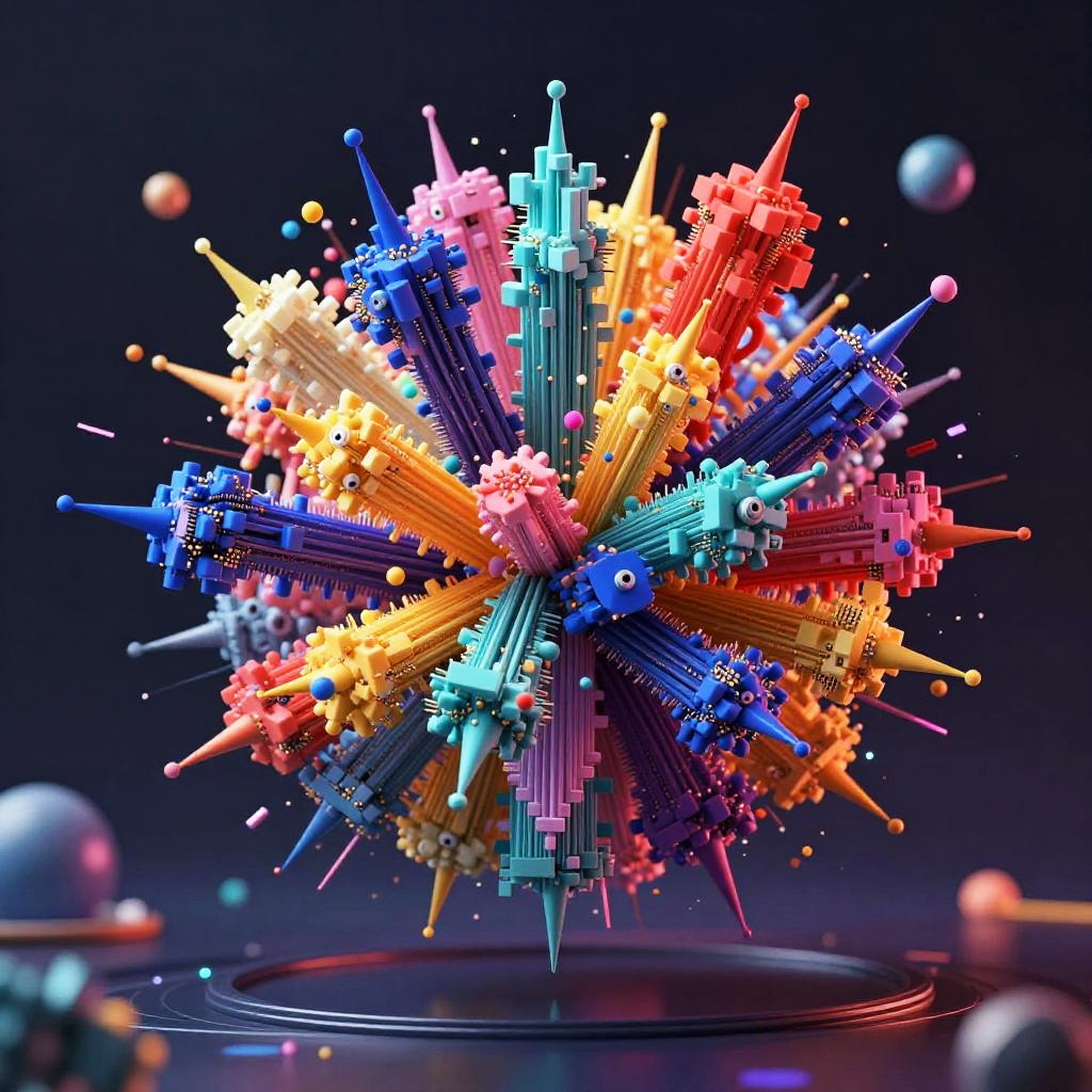 Digital art of a vibrant, abstract, futuristic sphere with swirling rainbow patterns, gears, and colorful spheres against a dark, tech-themed background.