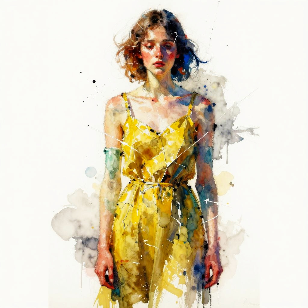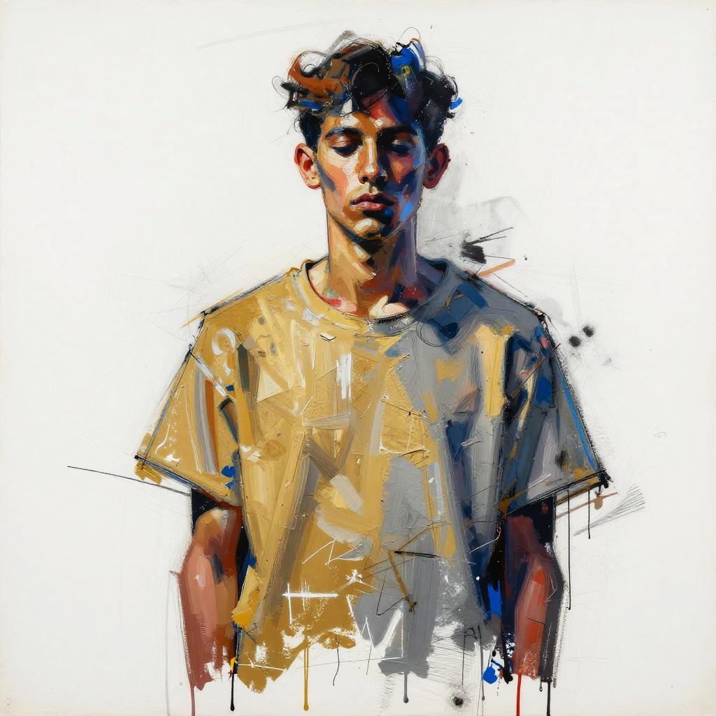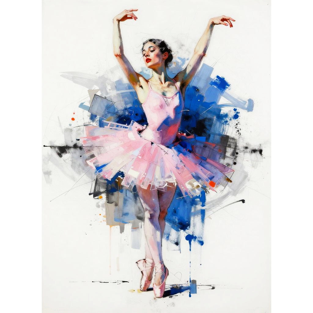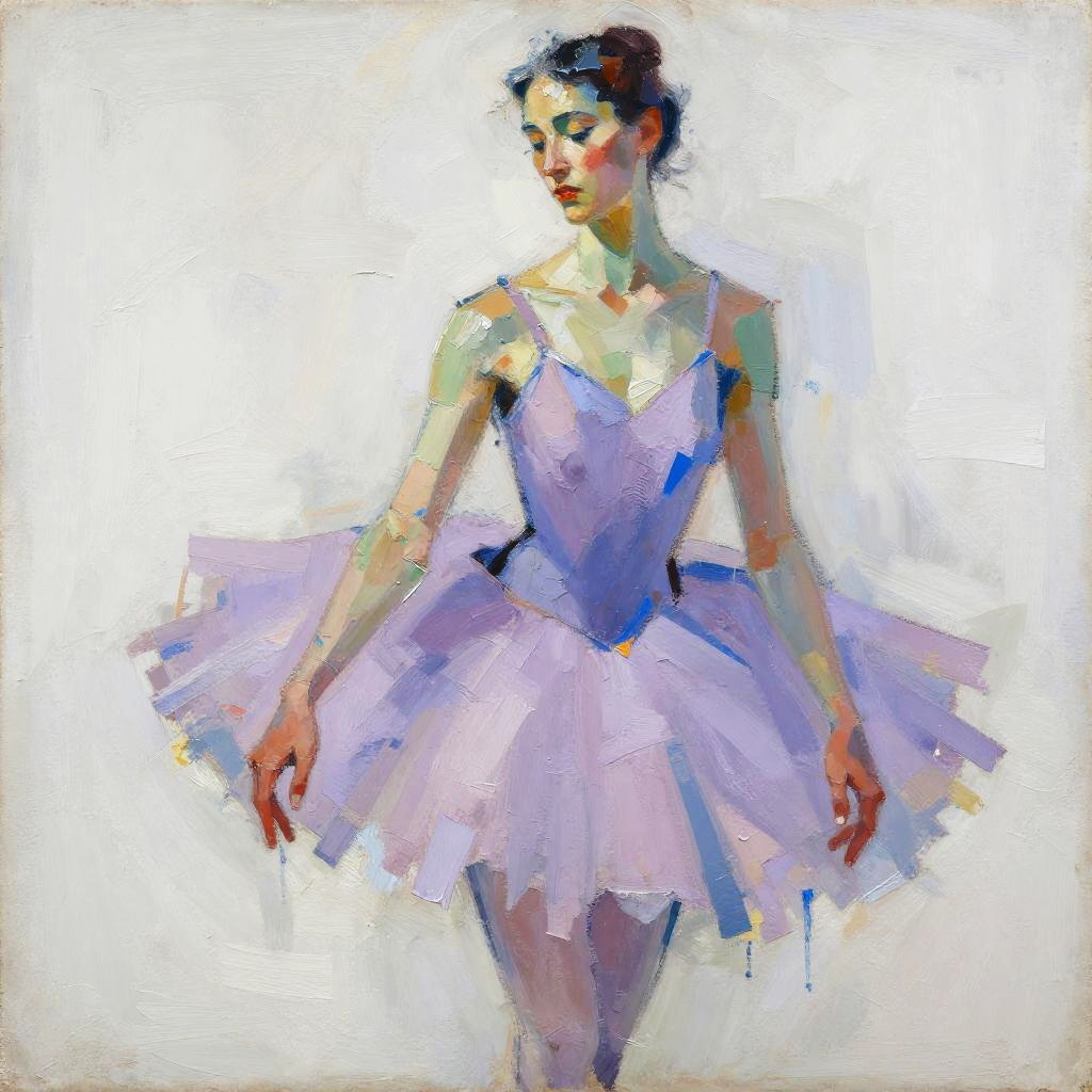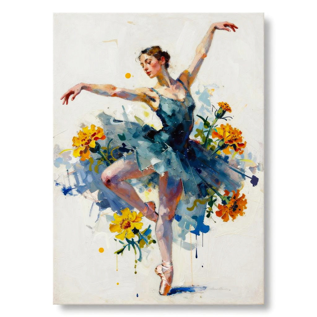 Expressionist semi-abstract portrait of dispersed ballerina figure adorned in smoky teal leotard with broken marigold limbs, rendered in lyrical neo-fauvist collage fusing fluid oil strokes and fractured impasto texture, high-contrast bold colors, loose gestural strokes and textured paint ridges, minimal white negative space with asymmetrical crop, cobalt-shadow accents and suggestive contours, emotive elegant tension mingled with wistful tranquility, contemporary art poster vibe, painterly chaos with subtle drips, unresolved edges, luminous highlights.