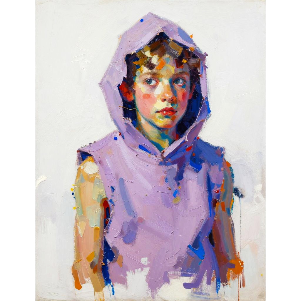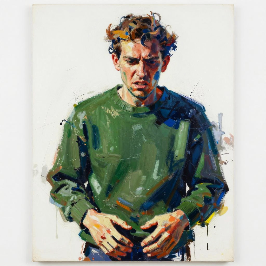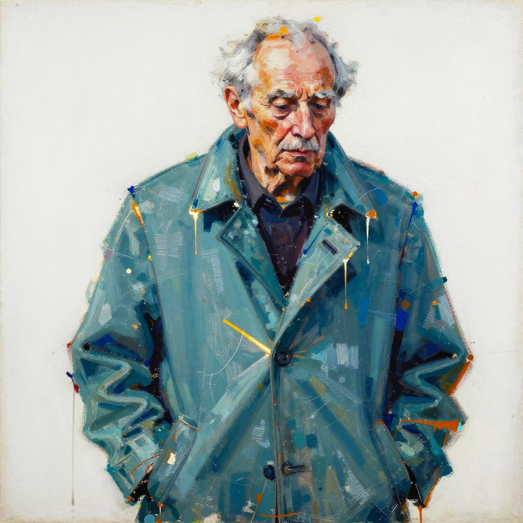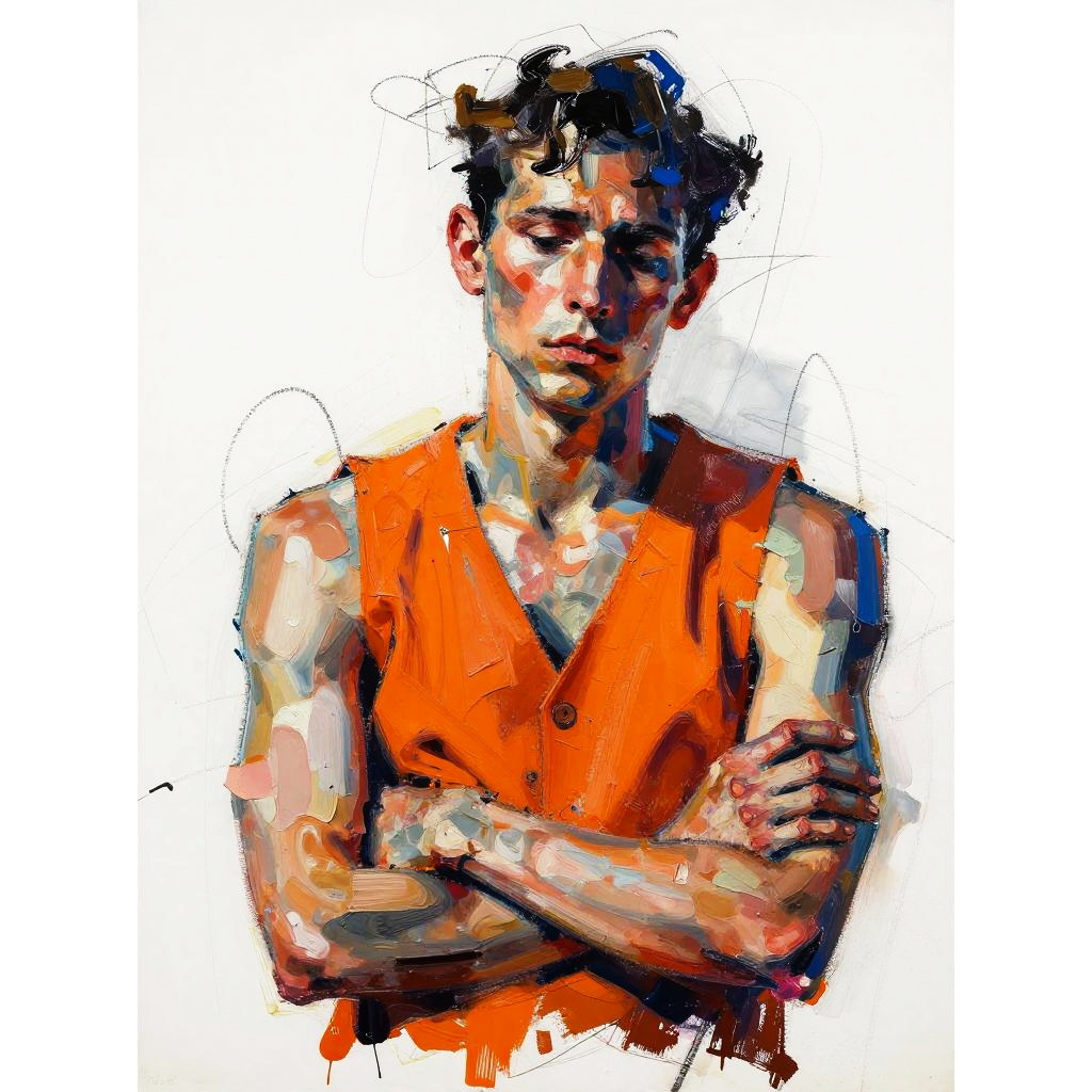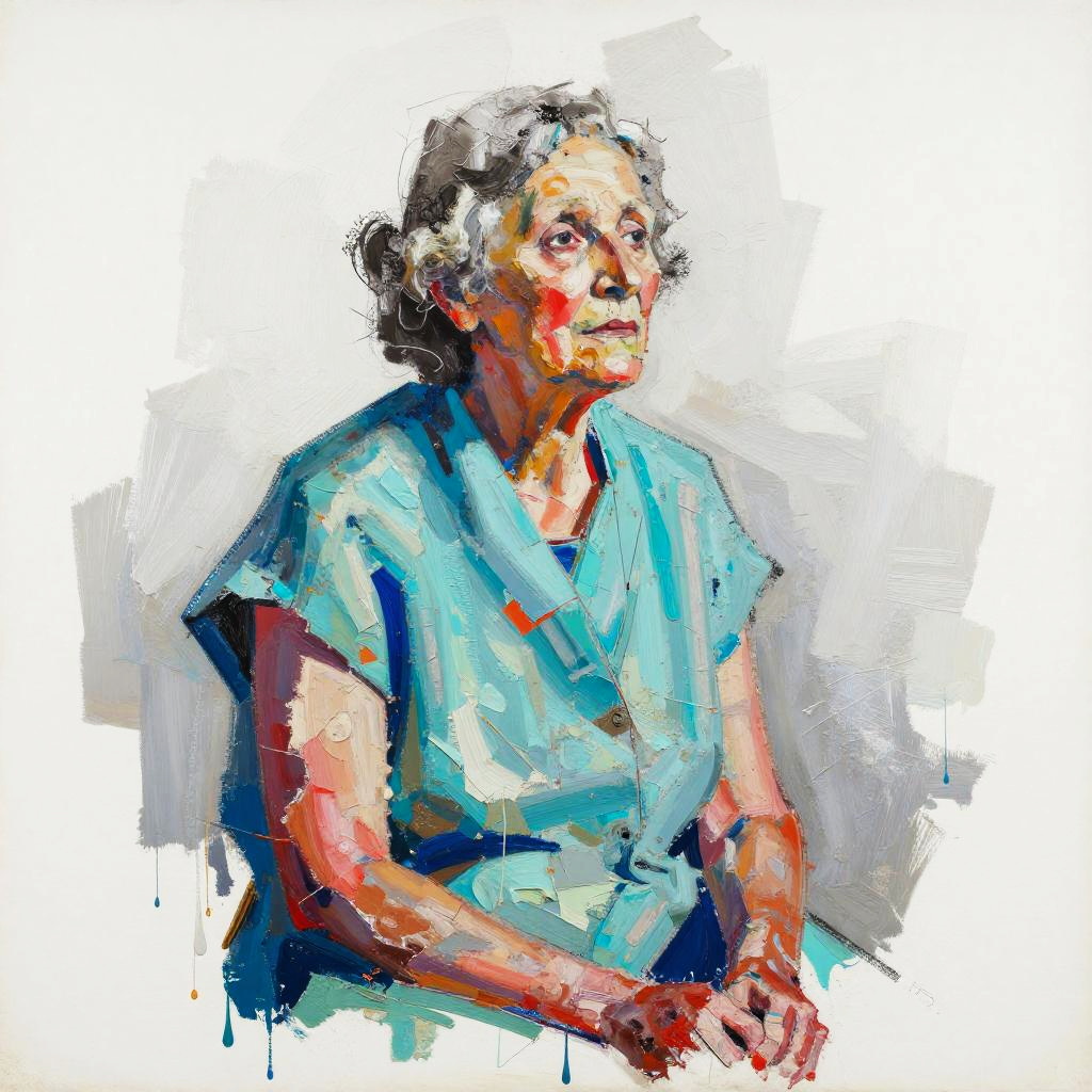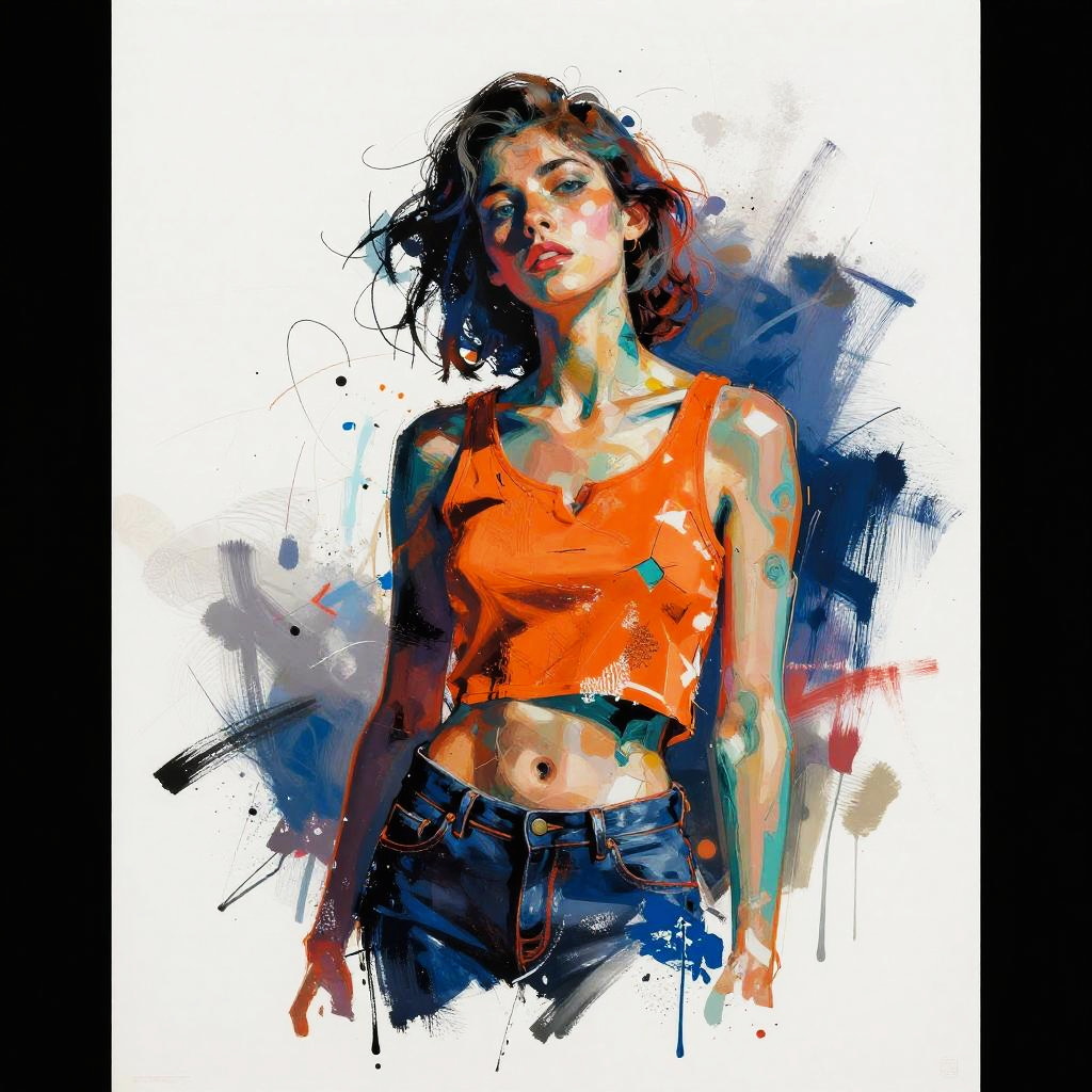 Expressionist semi-abstract portrait of dispersed ballerina figure adorned in smoky teal leotard with broken marigold limbs, rendered in lyrical neo-fauvist collage fusing fluid oil strokes and fractured impasto texture, high-contrast bold colors, loose gestural strokes and textured paint ridges, minimal white negative space with asymmetrical crop, cobalt-shadow accents and suggestive contours, emotive elegant tension mingled with wistful tranquility, contemporary art poster vibe, painterly chaos with subtle drips, unresolved edges, luminous highlights.