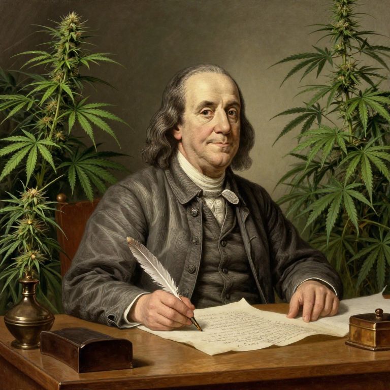 18th-century portrait of Benjamin Franklin writing with a quill, surrounded by cannabis plants, dark suit, wooden desk, ink bottle, and inkwell