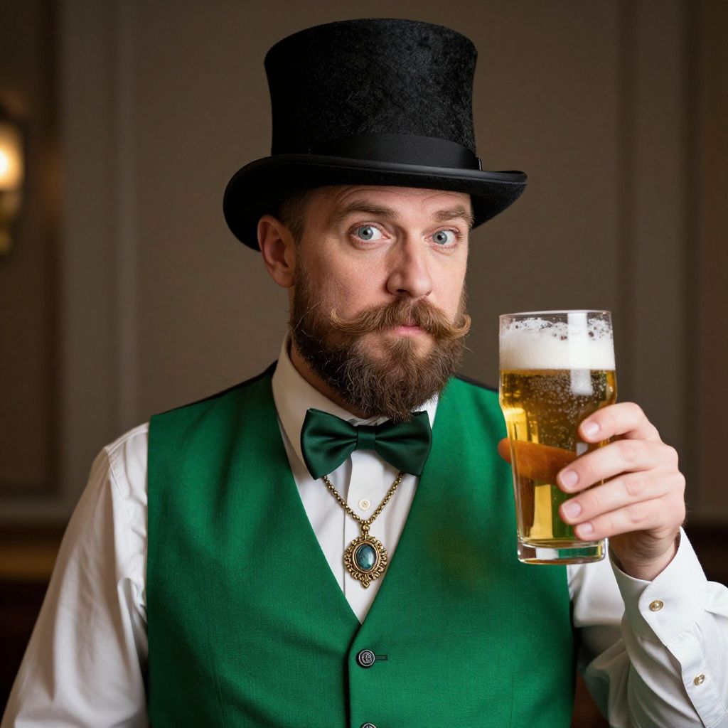 A bearded and mustachioed man with a distinguished look, sporting a top hat, is holding a frosty glass of beer. He is dressed in a vibrant green vest accented with a bow tie and wearing an elegant necklace around his neck.