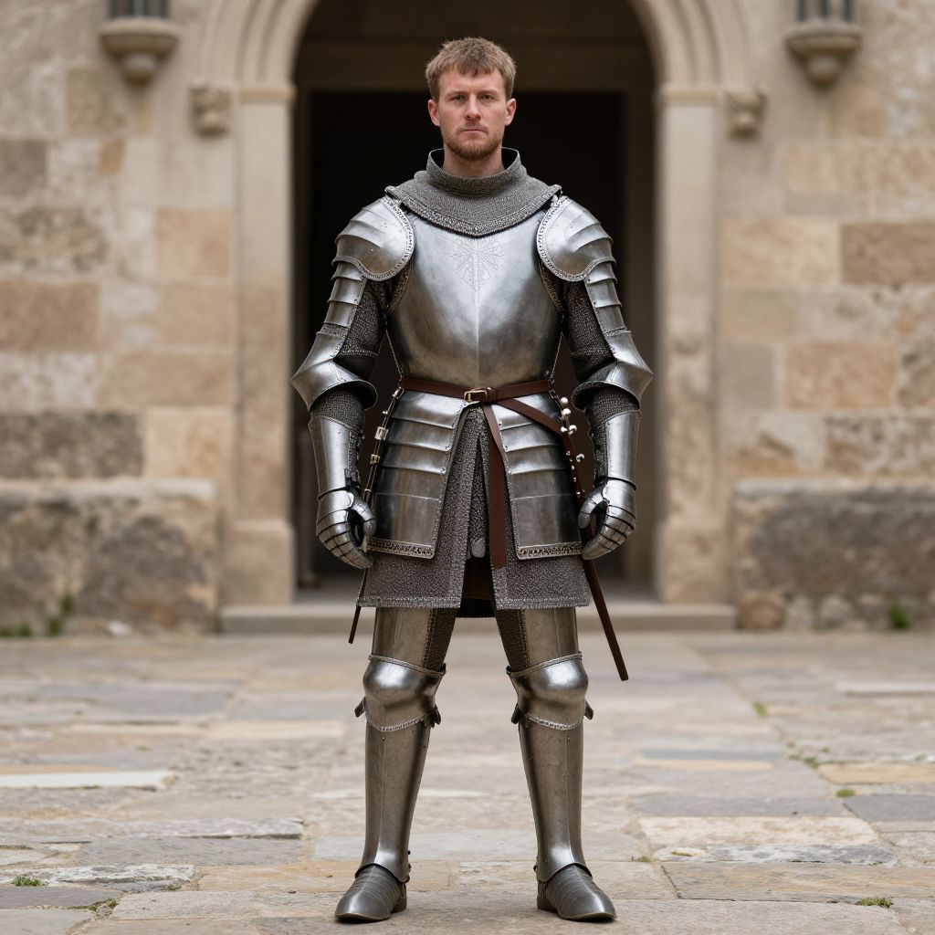 Photograph of a blond, bearded man in full medieval silver armor standing before a stone castle archway, with a blurred background.