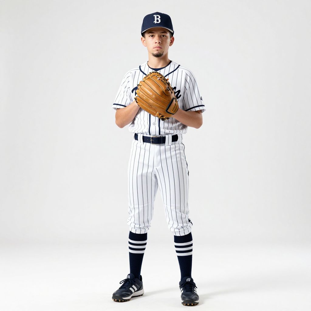 Baseball player adult, 1boy, solo, male focus, hat, sportswear, facial hair, baseball mitt, beard, full body, baseball uniform, baseball cap, striped clothes, standing, striped socks, baseball, simple background, white background, socks