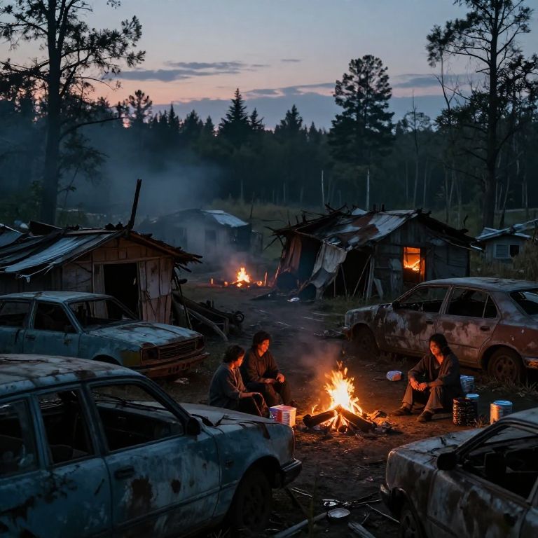 Post apocalyptic settlement at twilight, ramshackle huts built among twisted remnants of abandoned vehicles, campfires illuminating faces of weary inhabitants, scattered supplies, a distant mutated forest enveloping the horizon, moody, atmospheric lighting.