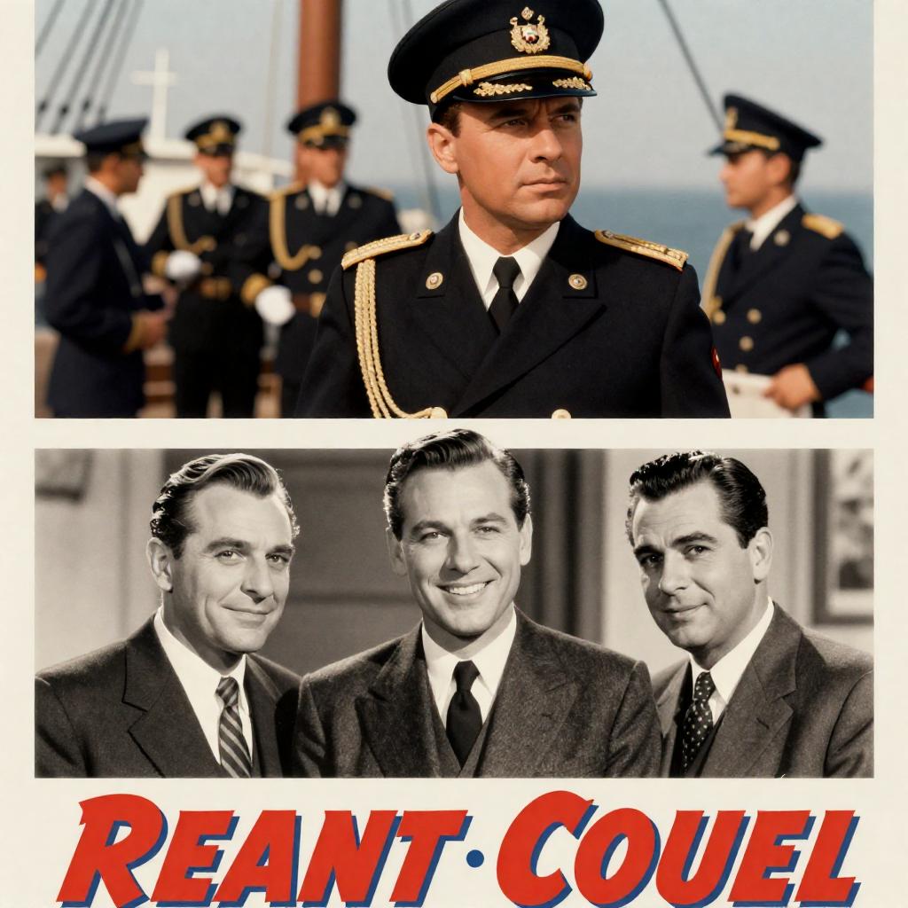 Vintage movie poster. Upper section: dark photograph of a ship with sailors on deck, one officer in foreground. Lower section: black-and-white photograph of three men in suits, one smiling. Bold red and blue at bottom.