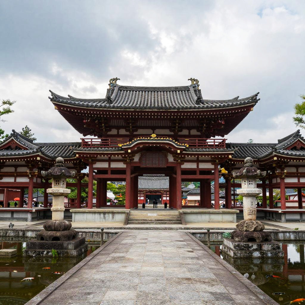 Ancient Japanese temple designs featuring traditional curved rooftops, ornate carvings, stone lanterns lining the pathway, and a peaceful koi pond reflecting the structure under a cloudy sky