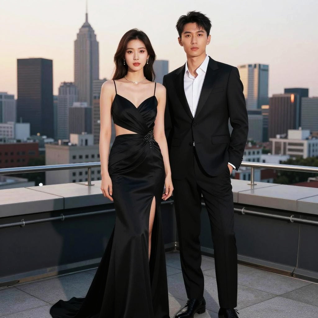 Photograph of an Asian couple standing on a rooftop with a cityscape of tall buildings in the background at dusk. The woman has long black hair, fair skin, and is wearing a black, sleeveless, form-fitting evening gown with a high slit and decorative bow on the side. The man has short black hair, fair skin, and is dressed in a black suit with a white dress shirt. Both have neutral expressions. The rooftop has a glass railing, and the lighting highlights their formal attire against the dimly lit skyline. The overall atmosphere is elegant and sophisticated.