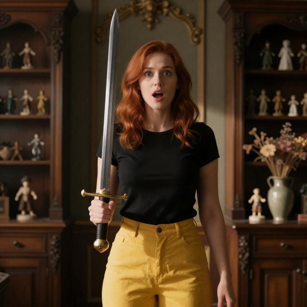 Photograph of a woman with shoulder-length auburn hair, wearing a black top and yellow pants, holding a sword upright. She stands in a dimly lit, ornate room with wooden furniture, shelves filled with figurines, and a vase of dried flowers. She has an open-mouthed, surprised expression. Warm sunlight streams in from the right.