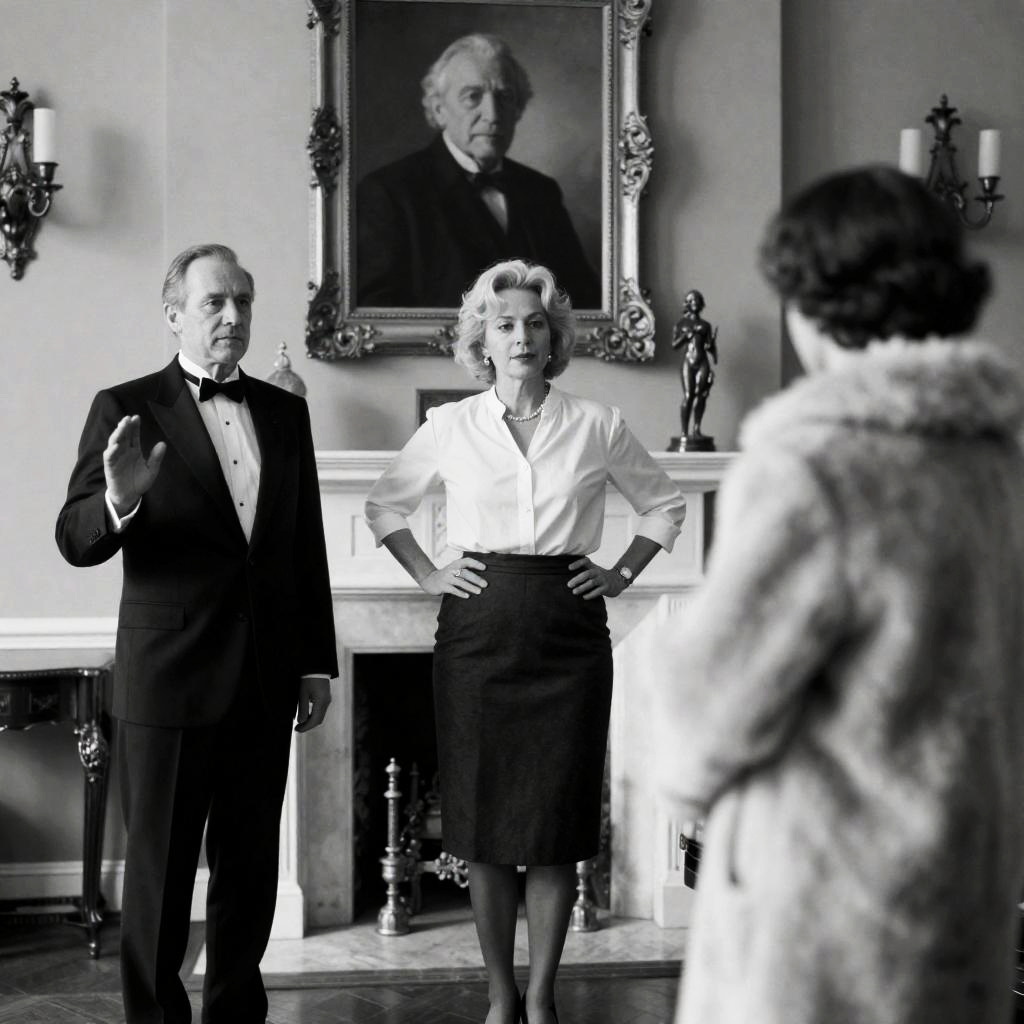 Black-and-white photograph. Three people in a room. Woman with short blonde hair, white blouse, dark skirt, standing center. Man in black suit, bow tie, standing left. Person with back to camera, fur coat, right foreground. Portrait of elderly man on wall, ornate frame. Wall sconce, right. Fireplace, center. Statuette on mantel. Woman's hands on hips. Man's right hand raised. Person in fur coat's expression not visible.