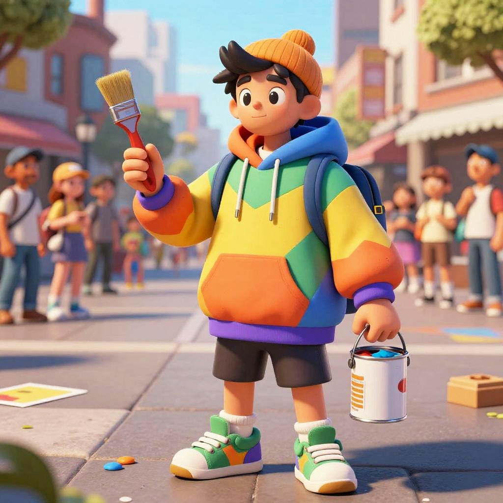 Realistic photo.a whimsical street artist, wearing a colorful oversized hoodie and sneakers, holding a brush and a can of paint, set in a lively city square with spectators, illustrated in the bold and cheeky anime style of Monkey Punch. realistic photo