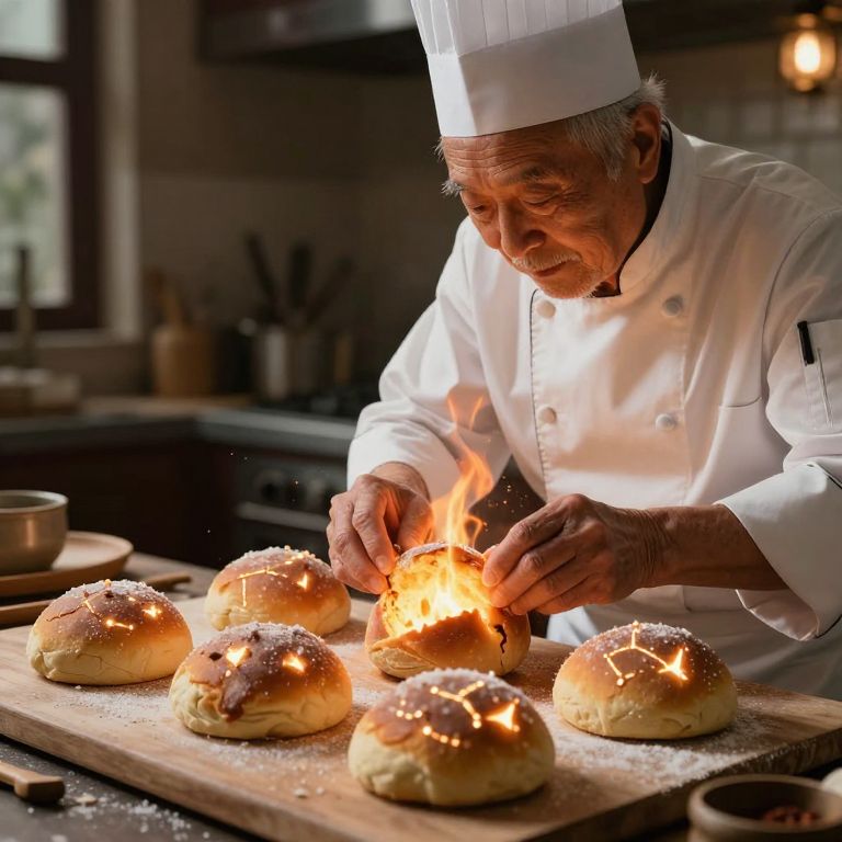 An elderly chef bakes constellations into bread loaves, each bite dissolving into glowing embers that recreate ancient myths.