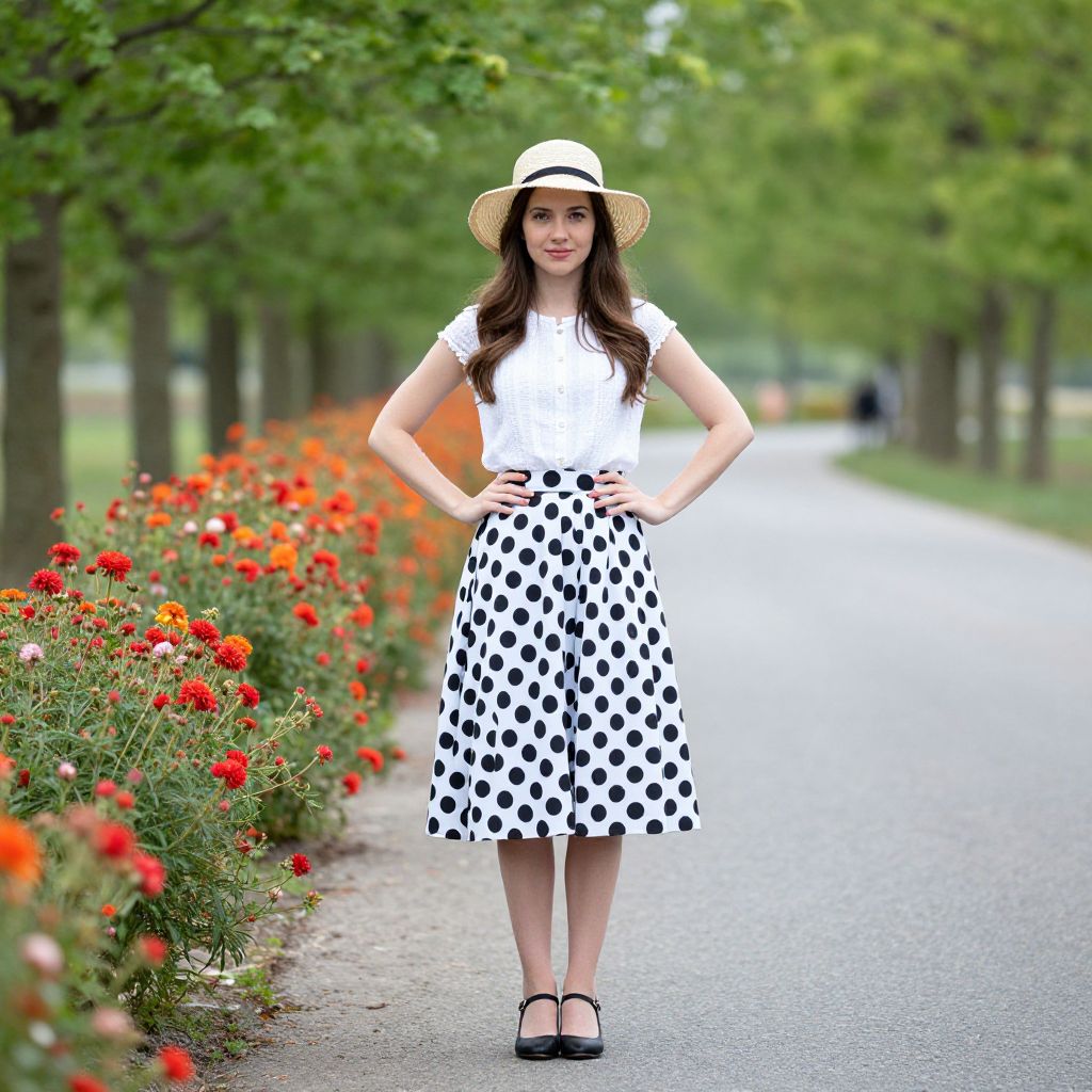 Orange blossom strawberry, solo, hat, brown hair, outdoors, hands on own hips, 1girl, road, flower, dress, full body, tree, skirt, polka dot