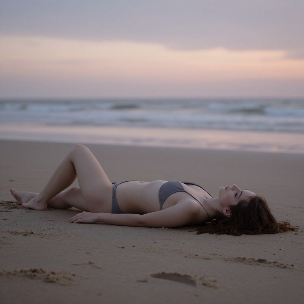 Dead woman in bikini lying on a deserted beach at sunset, mysterious atmosphere, soft pastel colors, a sense of eerie calm, detailed sandy textures and gentle waves in the background, cinematic lighting, surreal and somber mood