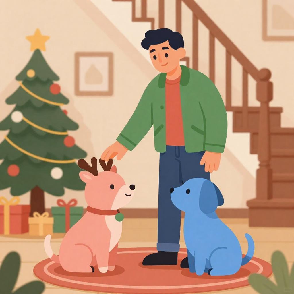 Digital illustration of a nighttime winter scene. A bald, elderly man in a blue coat stands to the left, holding a flashlight. A tall, mustached man in a green coat and red scarf stands to the right, also holding a flashlight. A vintage car is in the background. The sky is dark blue with stars and a faintly visible tree silhouette.
