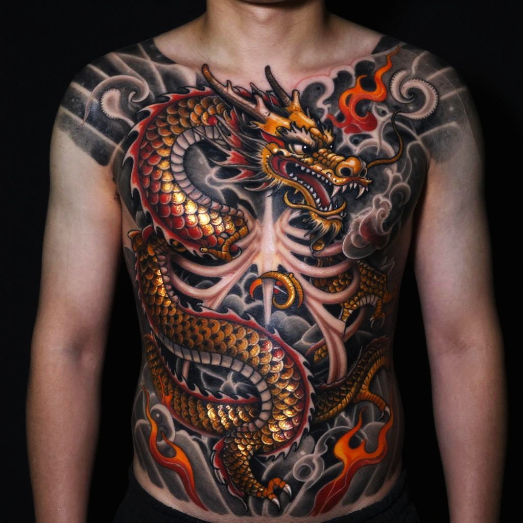 Sternum tattoo dragon intricately wrapping around ribs, vibrant scales shimmering in fiery reds and golds, detailed oriental style with smoke and flames, dark background