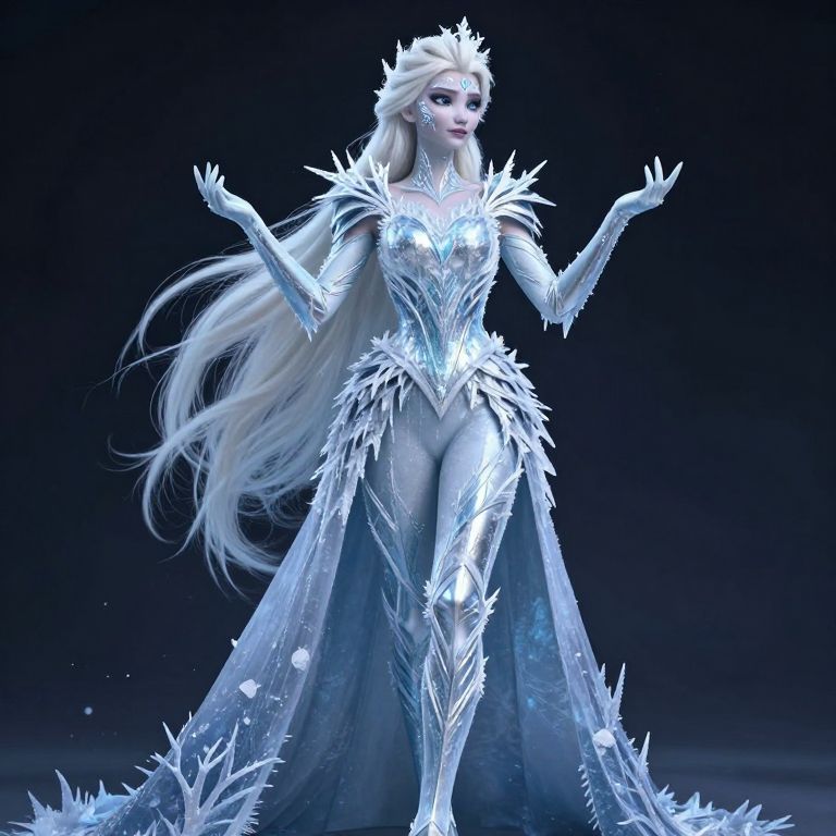 Digital artwork of a regal, white-haired woman in an icy, silver crown and gown with crystal-like armor, standing gracefully against a dark blue background