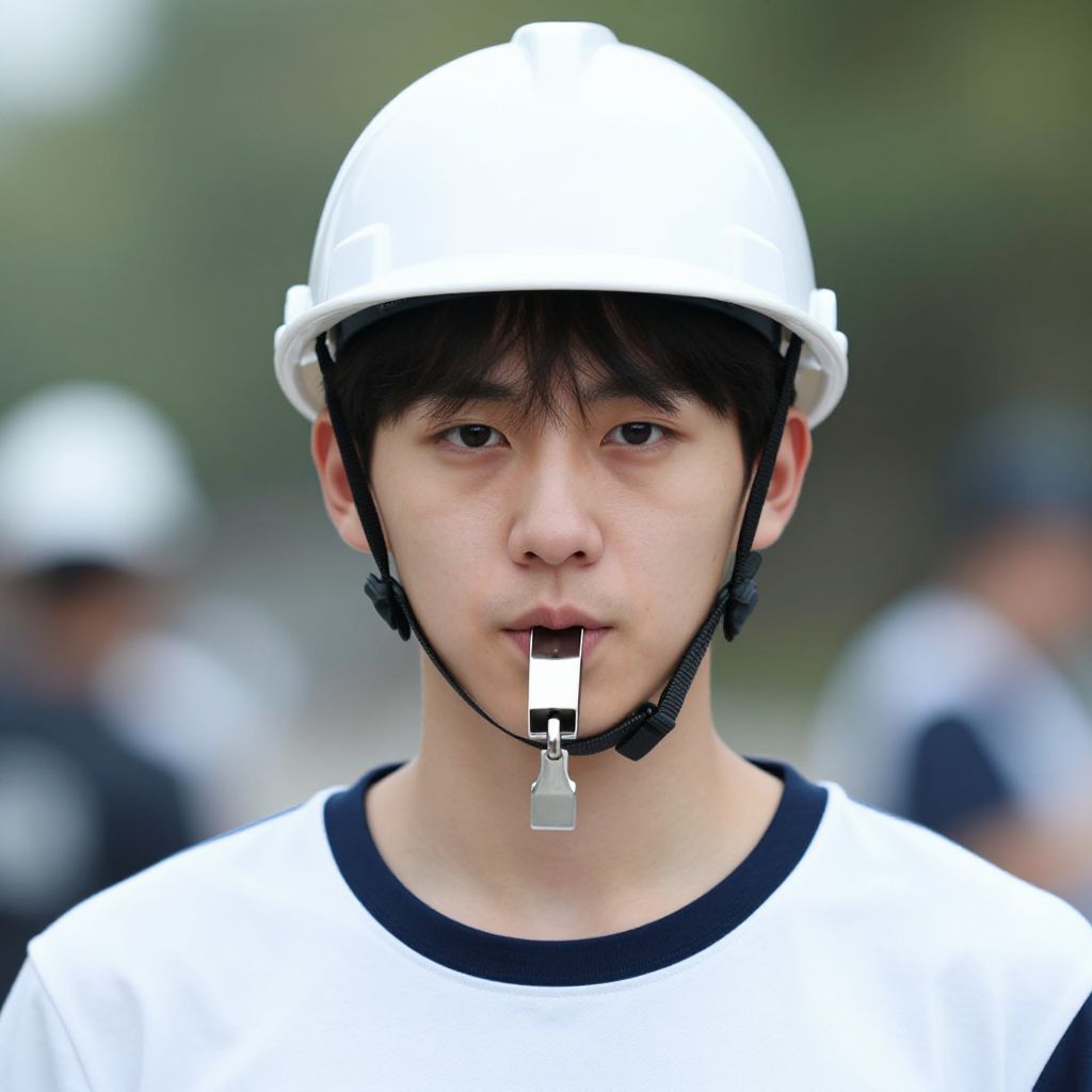 Boy wearing orange hard hat and grey work outfit with yellow and blue stripes.