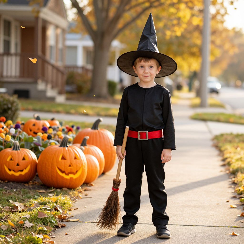 A young boy with curly brown hair and bright green eyes is wearing a handmade pumpkin costume, with a small patchwork jacket and a red scarf tied around his neck. He stands confidently in a serene autumn forest, where golden leaves swirl gently in the breeze, and a large, glowing pumpkin rests on his head. The forest is surrounded by tall, twisted trees with mossy bark, and soft sunlight filters through the canopy, casting warm, dappled shadows on the ground. The atmosphere is whimsical and joyful, capturing a moment of autumnal magic.