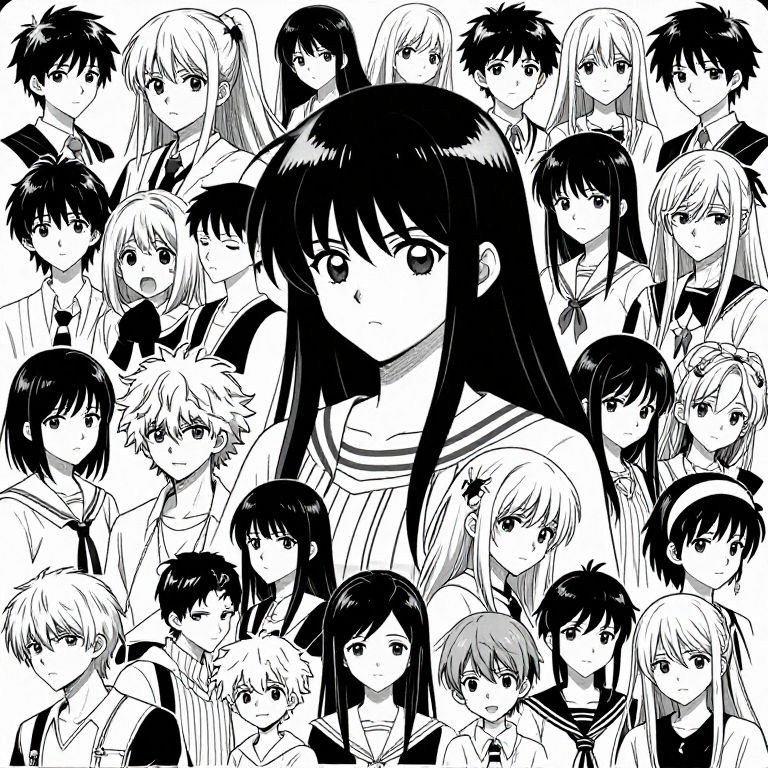 The image is a black and white illustration featuring a dense pattern of various anime-style characters. The central figure is a large, prominent character with long hair and a distinctive hairstyle, wearing a striped shirt. Surrounding this central figure are numerous smaller characters, each with unique hairstyles, expressions, and accessories. The characters are arranged in a seemingly random pattern, creating a sense of depth and complexity. The overall composition is dynamic, with characters overlapping and interacting in a visually engaging manner. The use of black and white enhances the contrast and highlights the intricate details of each character's design.
