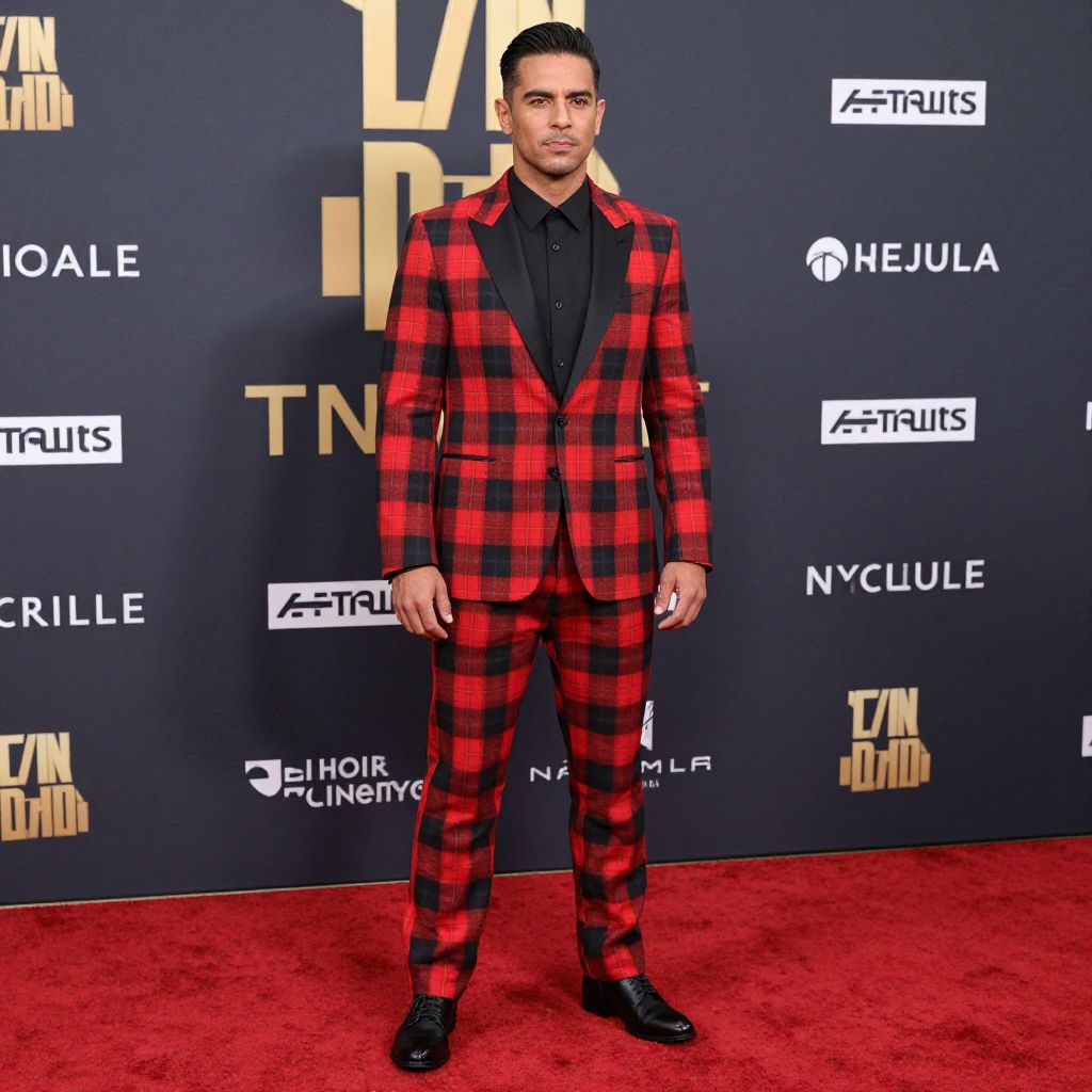 Flannel Clothes Costume, man in a red and black suit standing on a red carpet