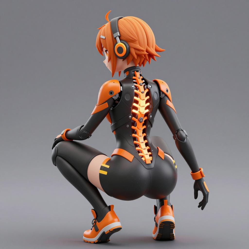 3D rendered image of a futuristic anime girl with orange hair wearing a sleek black and orange cybernetic suit. The character is squatting, shown from behind, with an illuminated mechanical spine and high-tech headset. She wears matching sneakers and gloves, set against a neutral gray background.